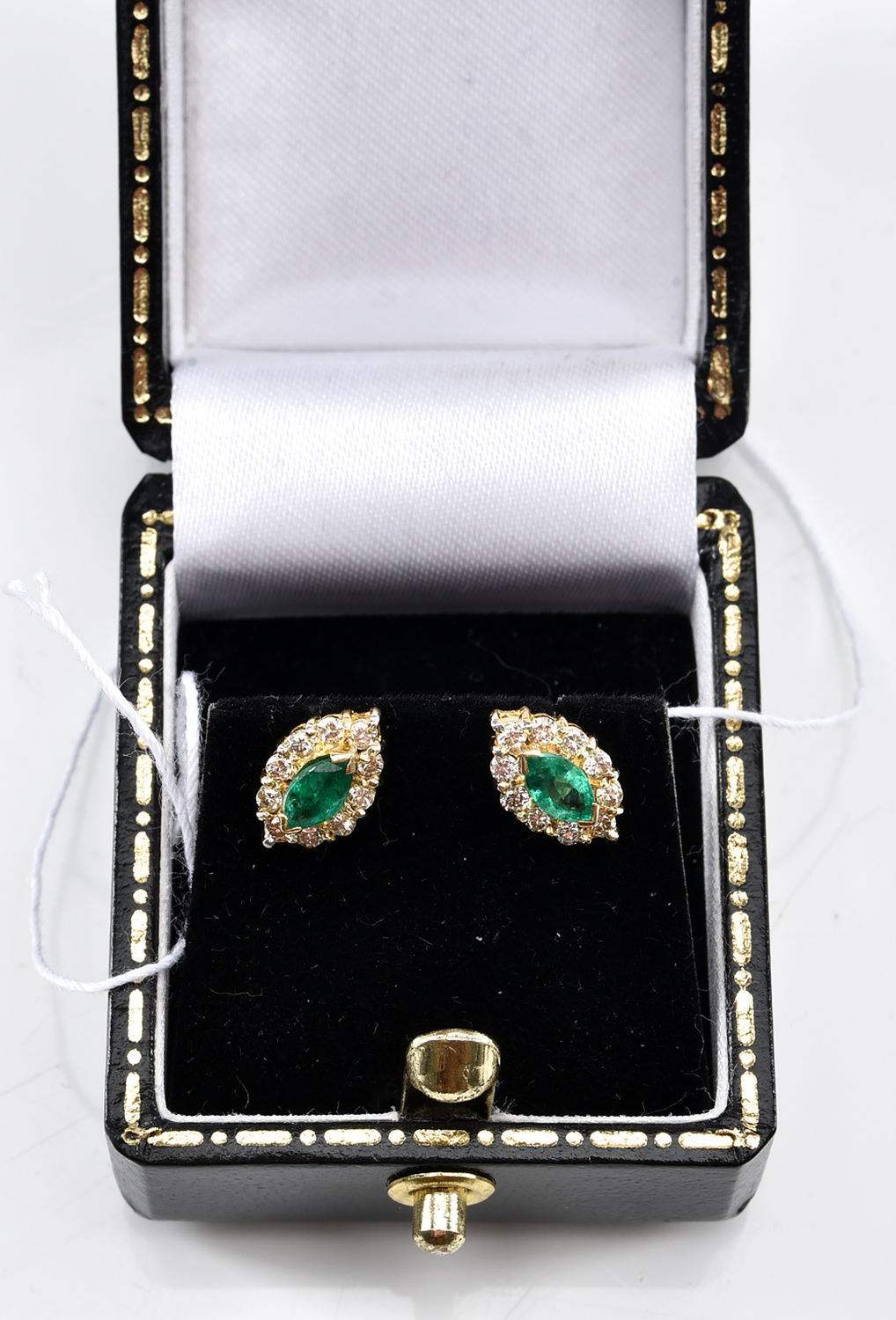 A PAIR OF EMERALD AND DIAMOND STUD EARRINGS IN 14CT GOLD, BOXED