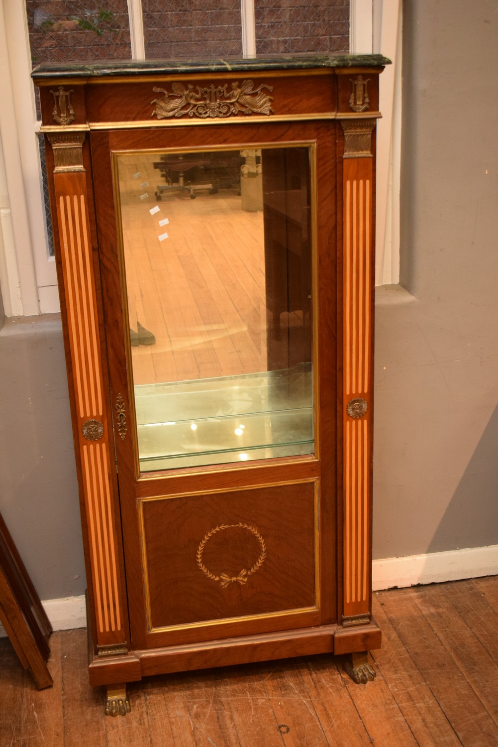 A FRENCH STYLE DECORATIVELY INLAID GLASS FRONTED VITRINE WITH MARBLE TOP (163H X 79W X 41D CM) (PLEASE NOTE THIS ITEM MUST BE REMOVED BY CLIENTS OR CARRIERS AT THE CUSTOMERS EXPENSE)