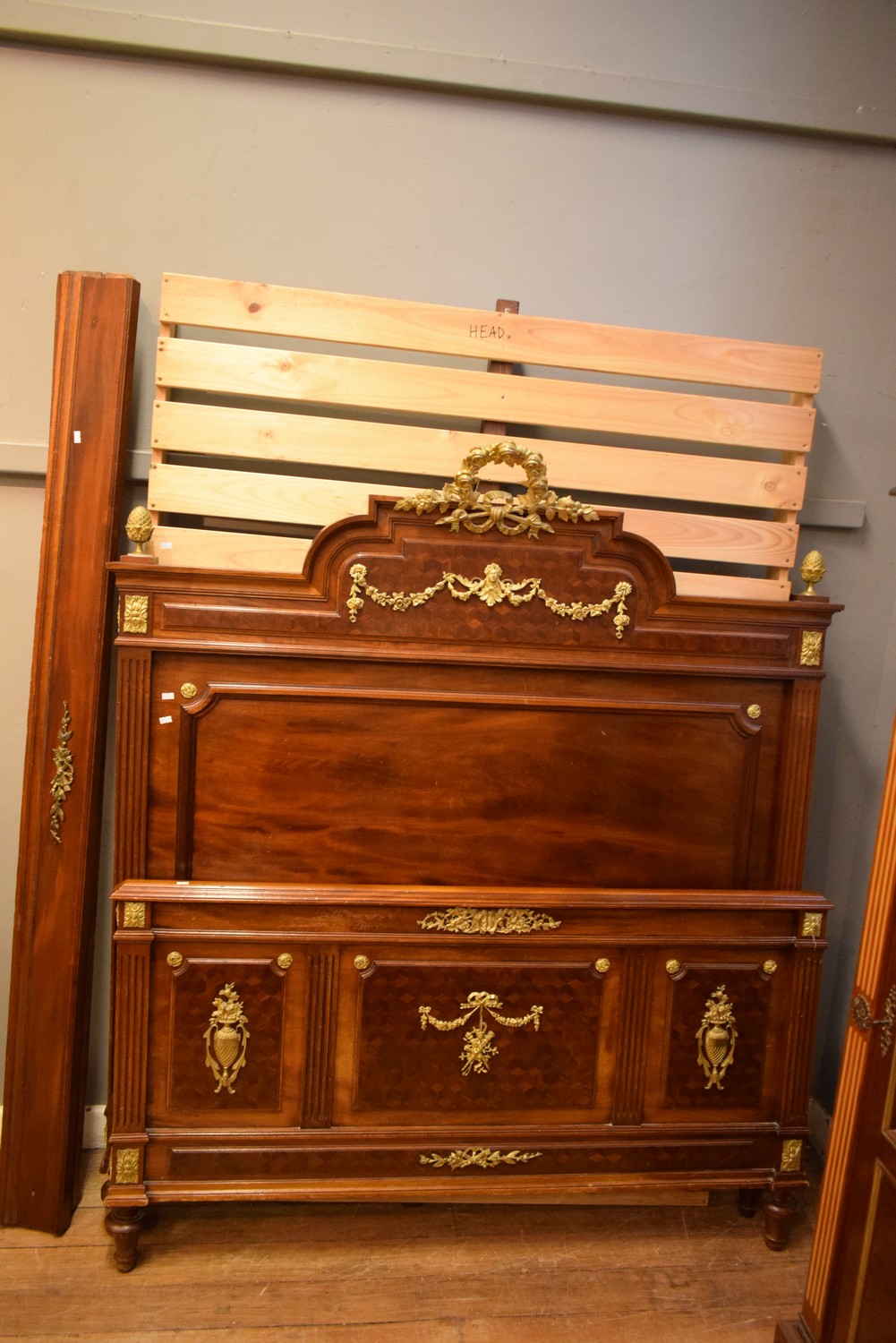 A DECORATIVELY INLAID FRENCH STYLE BED WITH RAILS AND BASE (A/F) (BED HEAD 166H X 147W CM)