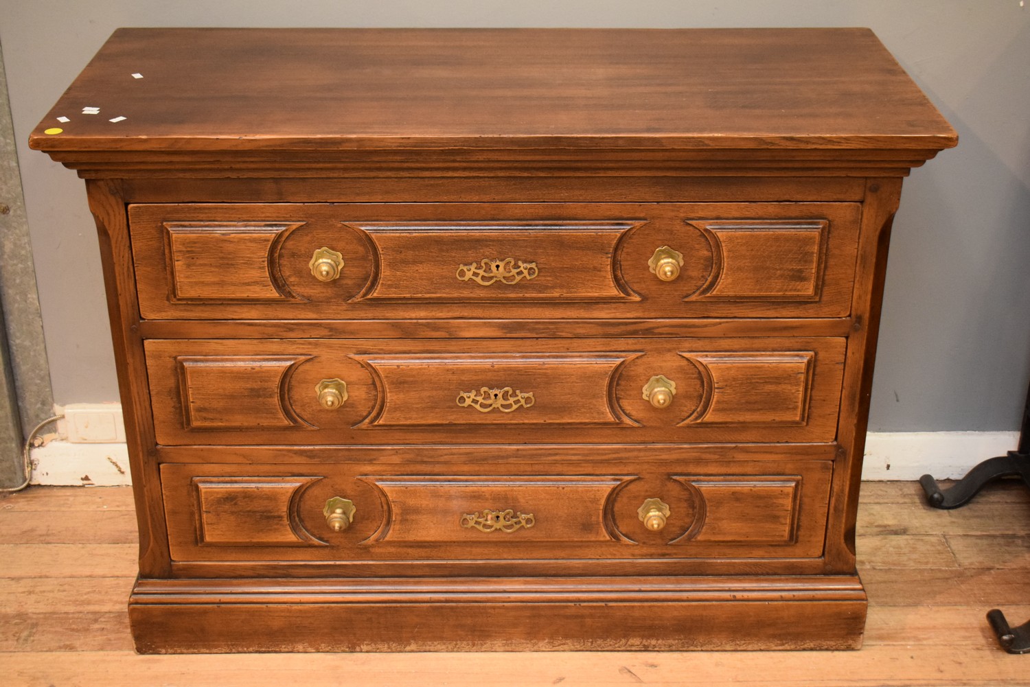 A TIMBER THREE DRAWER CHEST (92H X 129W X 56D CM)