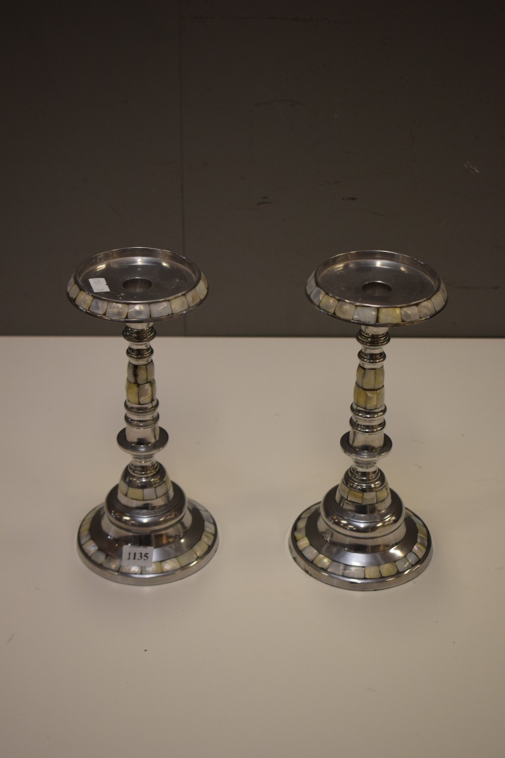 A PAIR OF SHELL INLAY CANDLESTICKS (26H X 12D CM)
