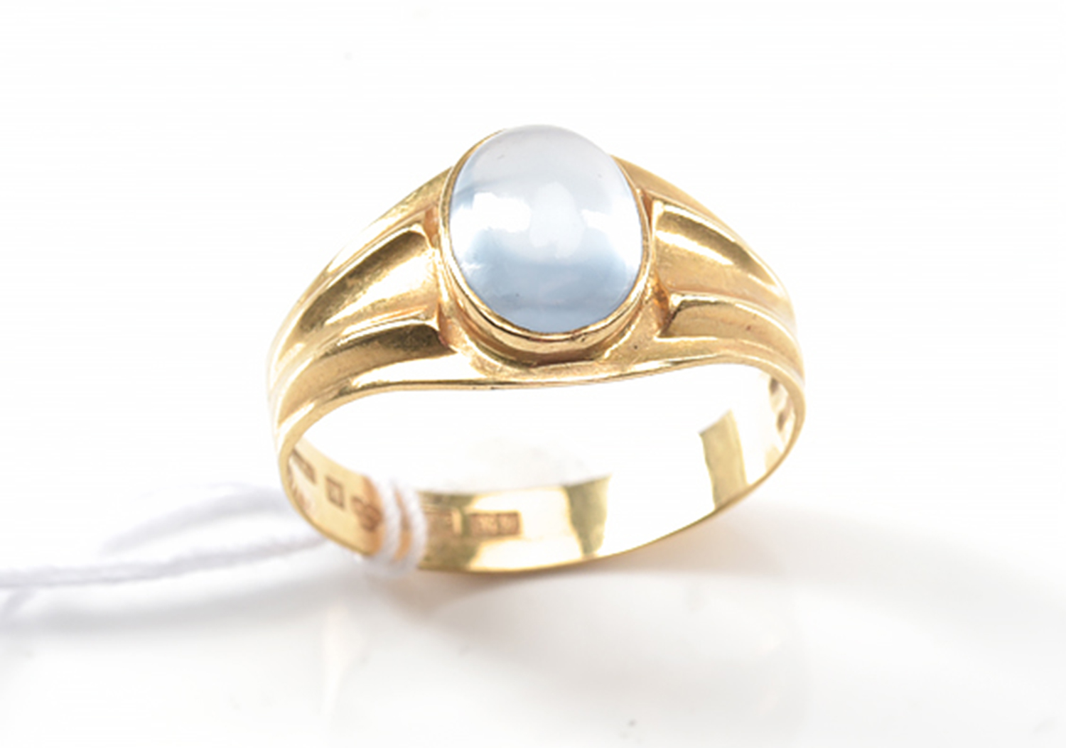 A RETRO SWEDISH RING SET WITH A MOONSTONE CUT EN CABOCHON, IN 18CT GOLD, ASSAY MARK FOR MALMÖ, DATED 1962, MAKER'S MARK G.D&C. SIZE K, 2.2GMS