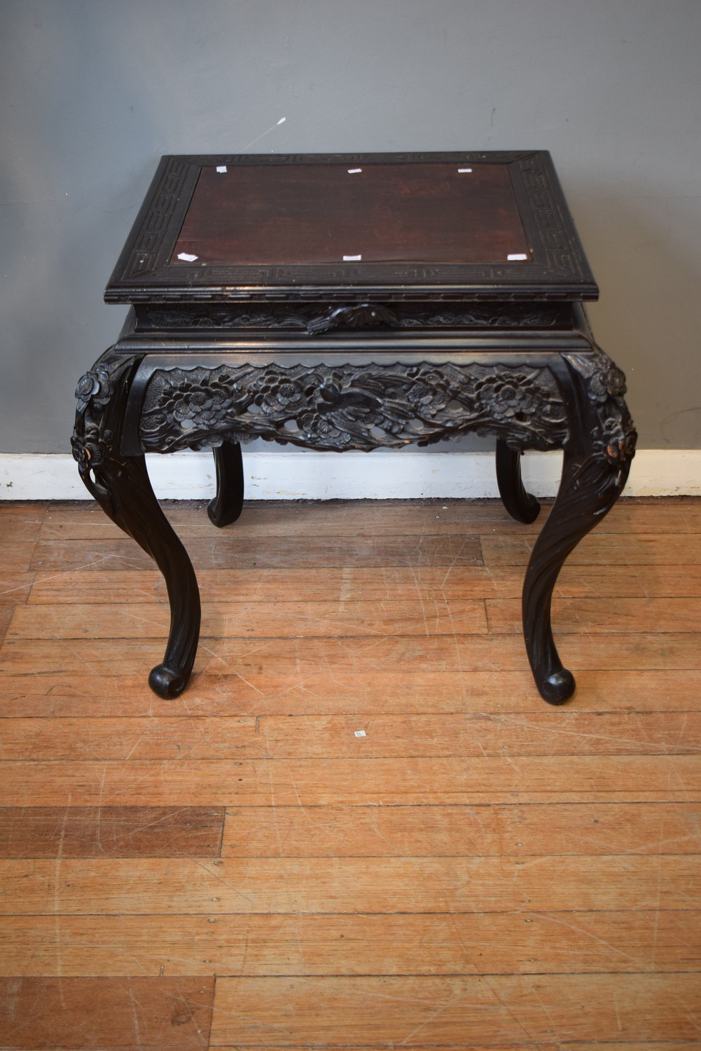 A DECORATIVELY CARVED EBONISED CHINESE SIDE TABLE (A/F) (80H X 80W X 80D CM)