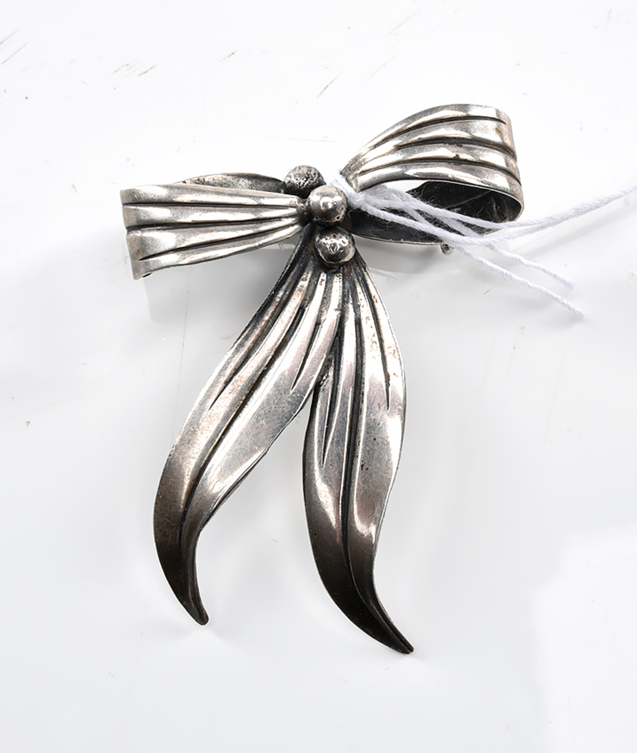 A SWEDISH BOW BROOCH IN STERLING SILVER, ASSAY MARK FOR STOCKHOLM, CIRCA 1951, MAKER'S MARK F.P, 50x35MM