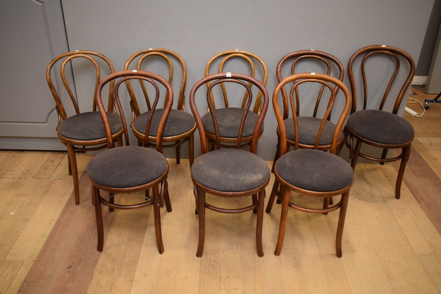 A HARLEQUIN SET OF EIGHT DREVOUNIA BENTWOOD DINING CHAIRS, CZECHOSLOVAKIA (85H X 44W X 52D CM)