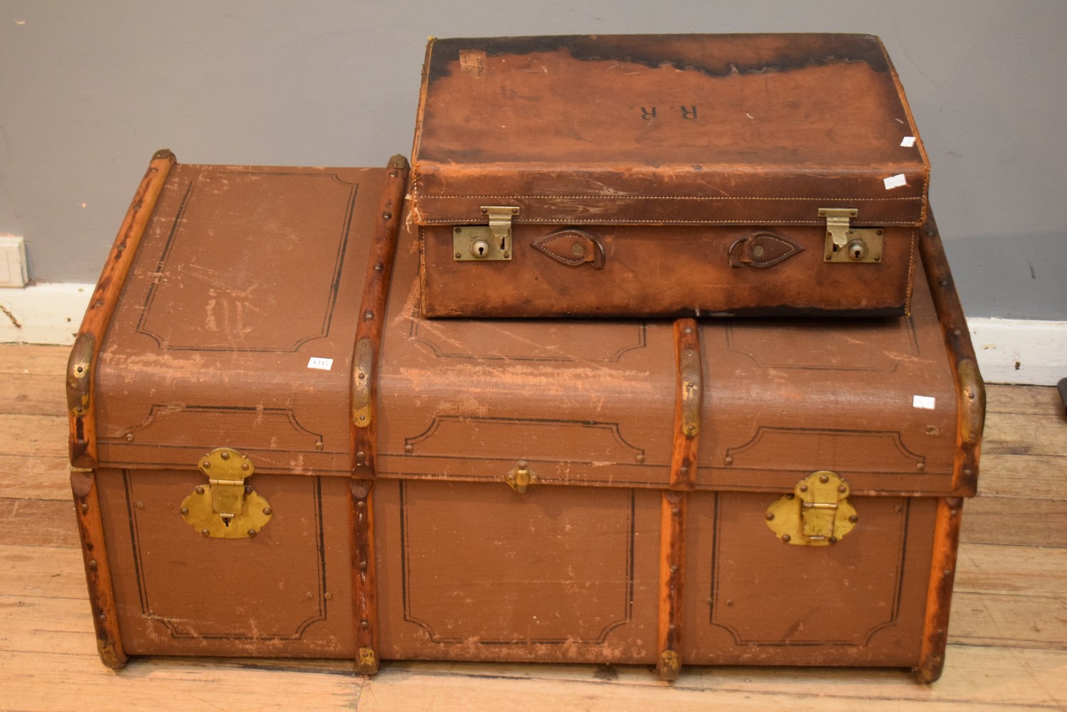 A VINTAGE TRAVELLER'S TRUNK AND SUITCASE (A/F) (TRUNK 47H X 102W X 58D CM)