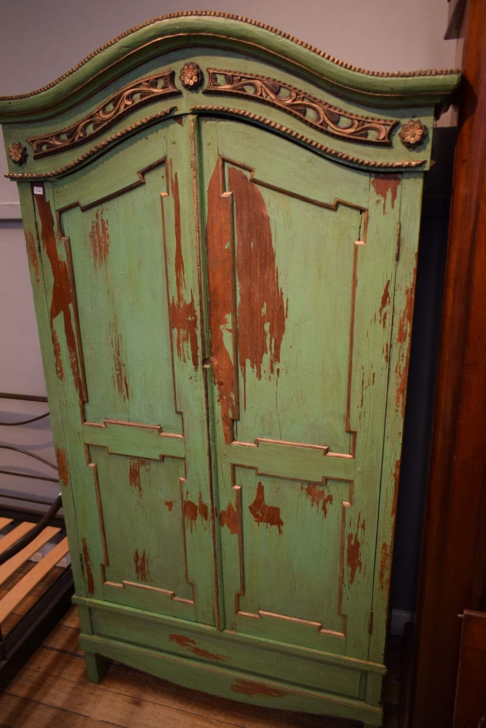 A TWO DOOR DUTCH/INDONESIAN SOLID WOOD GREEN PAINTED RUSTIC ARMOIRE (199H X 110W X 55D CM) (PLEASE NOTE THIS ITEM MUST BE REMOVED BY CLIENTS OR CARRIERS AT THE CUSTOMERS EXPENSE)