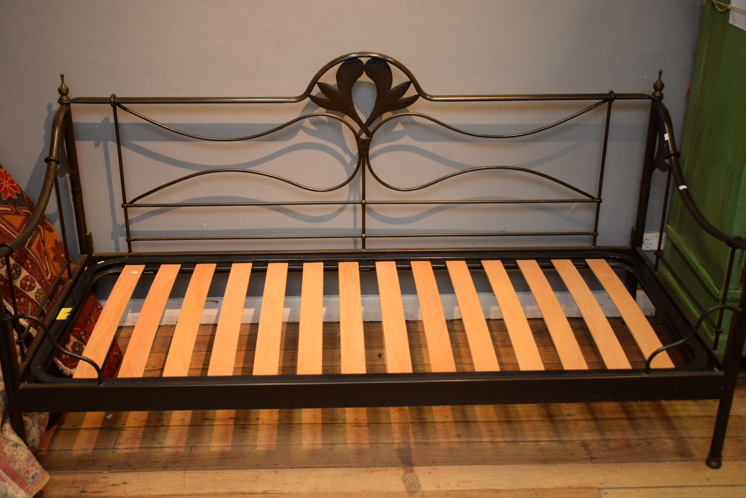 A FRENCH STYLE BURNISHED STEEL DAYBED WITH SLATS (100H X 196W X 86D CM)