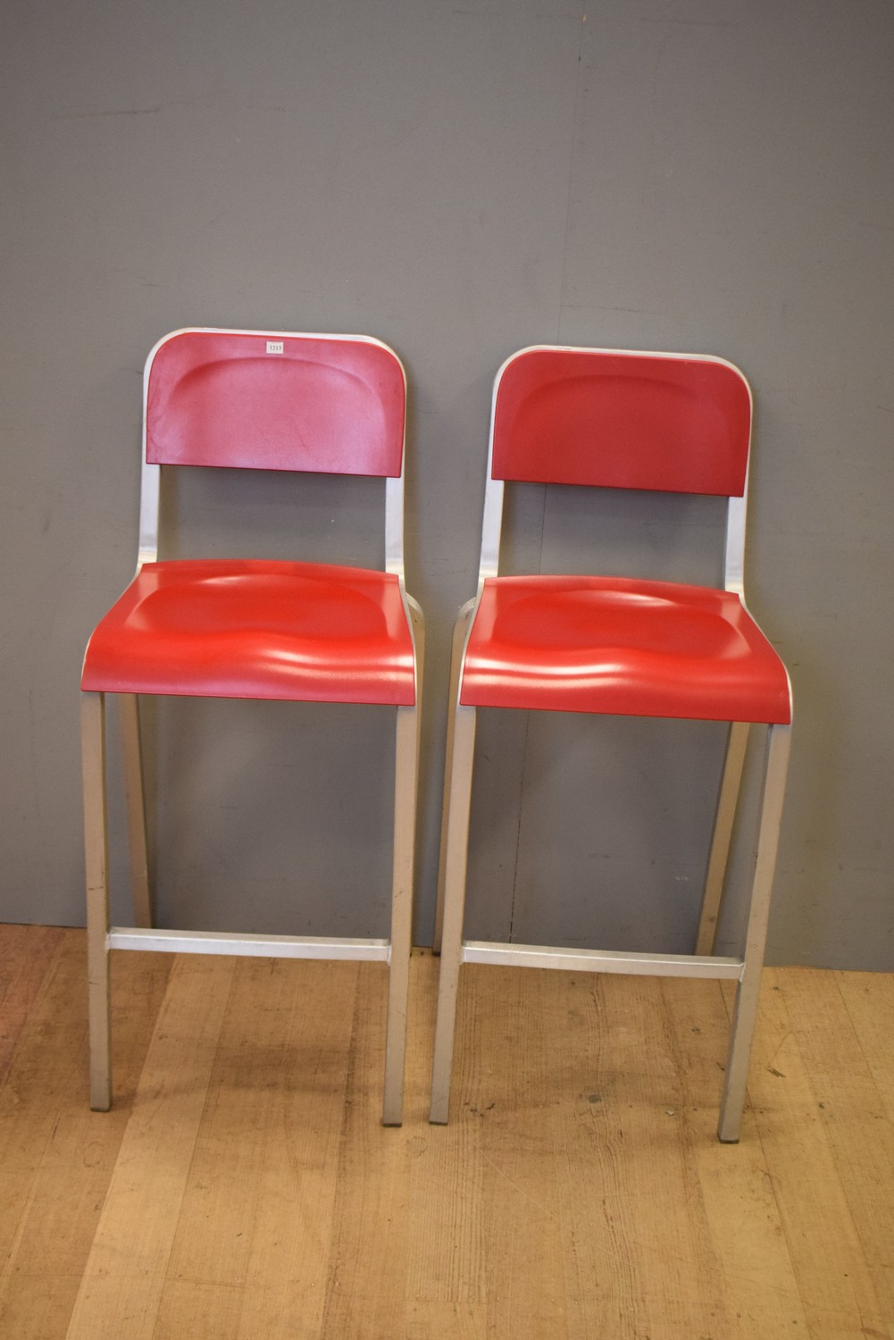 A PAIR OF EMECO RED AND BRUSHED METAL BAR STOOLS (111H X 47W X 55D CM)
