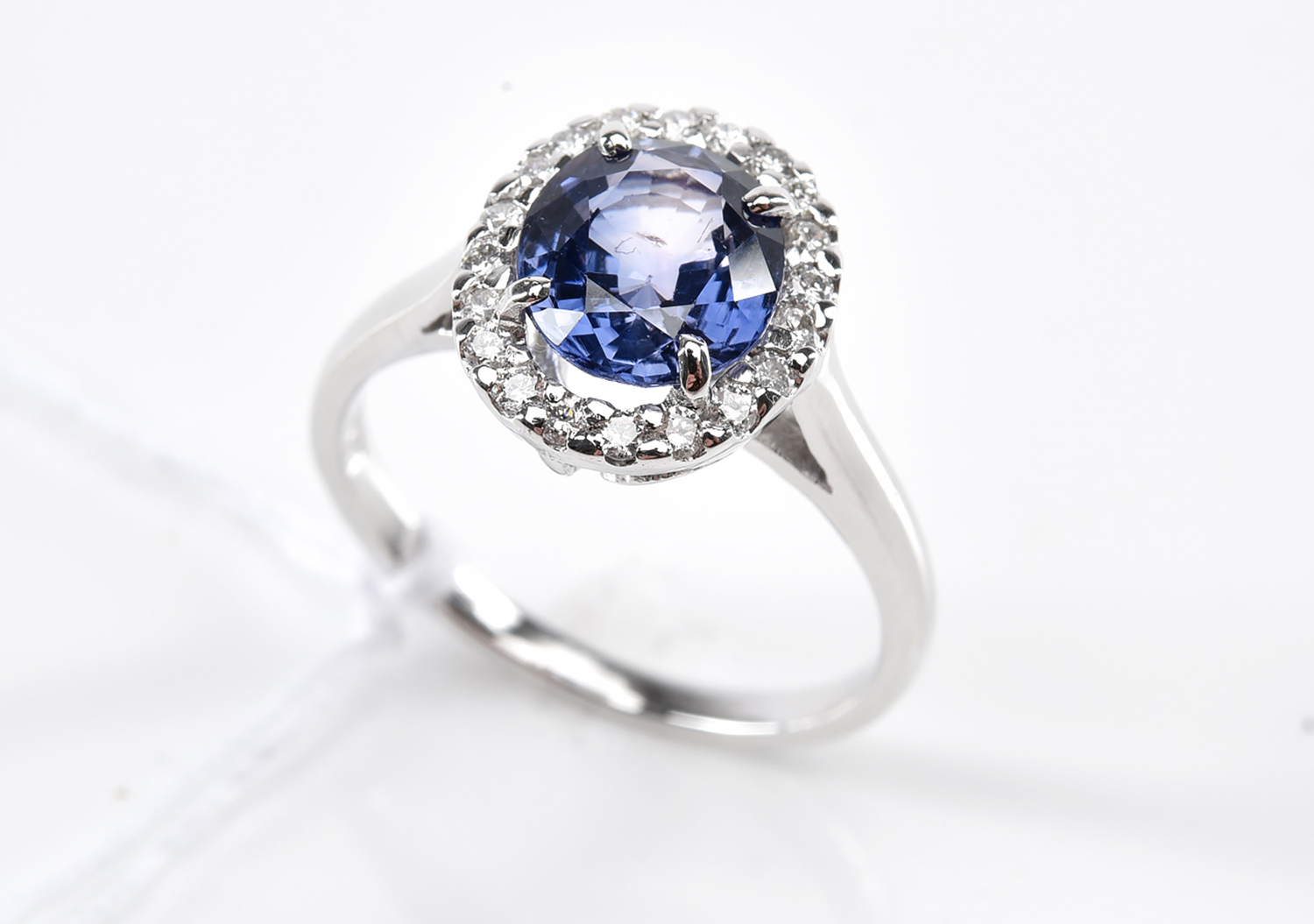 A SRI LANKAN INDIGO BLUE SAPPHIRE (WEIGHING 2.25CTS) CLUSTER RING, IN 18CT WHITE GOLD, SIZE N, WITH AIG REPORT STATING NO INDICATION OF HEAT, 3.6GMS