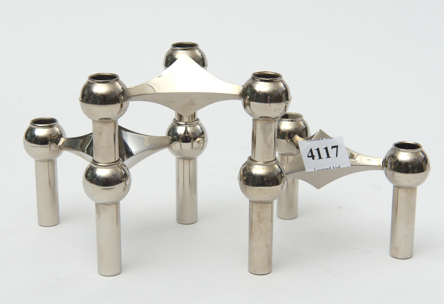 THREE BOXED NAGEL VARIANTE S22 CANDLESTICKS TOGETHER WITH ORIGINAL BLACK CANDLES