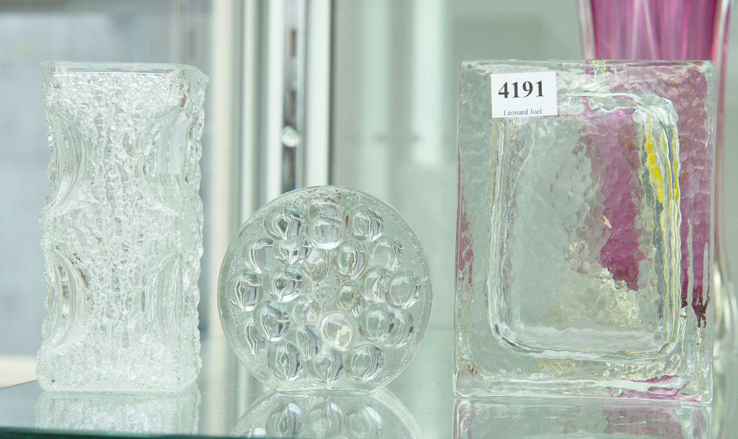 GROUP OF THREE MID-CENTURY GLASS VASES H.13, 12.5 & 8CM