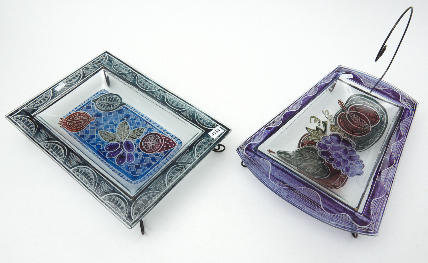 TWO DECORATIVE ART GLASS ENAMEL PAINTED PLATTERS ON STANDS BY R FREE FREEMAN,