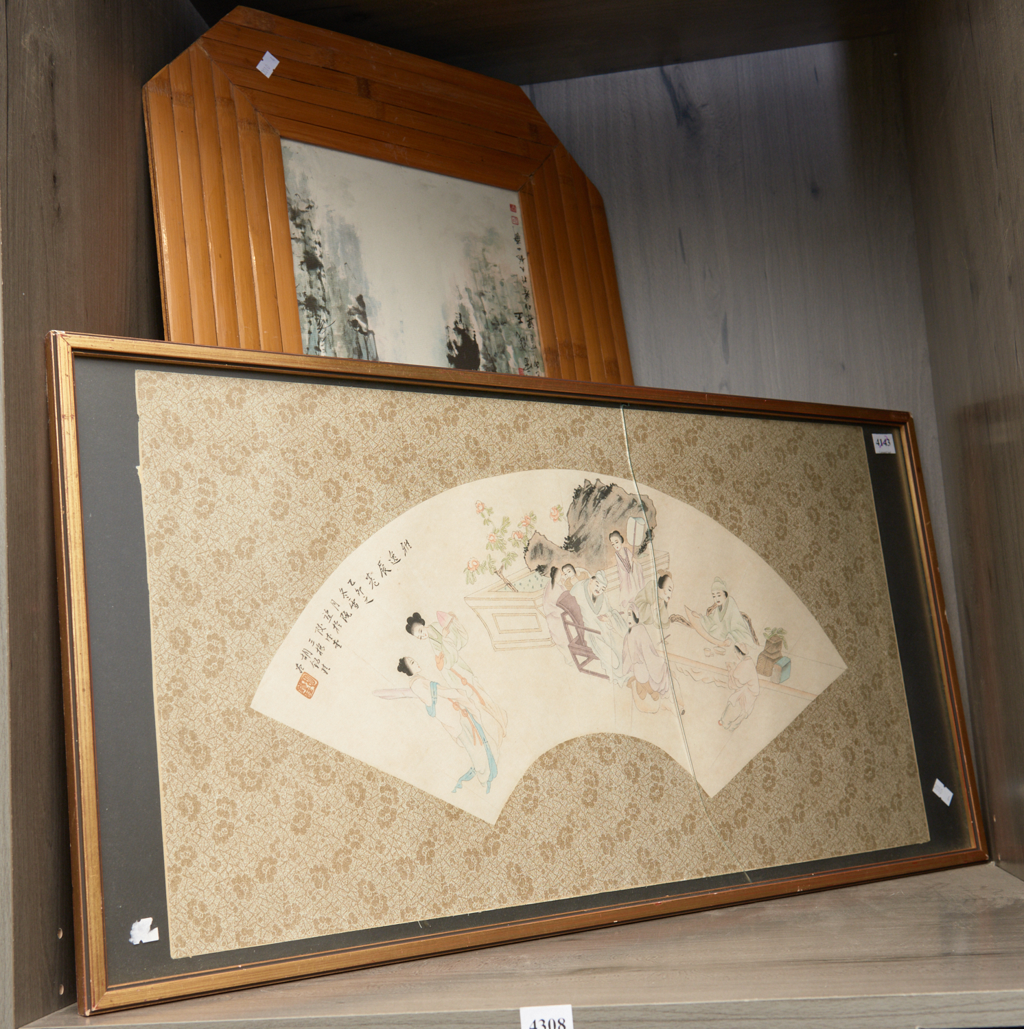 A FRAMED CHINESE FAN SHAPED WATERCOLOUR (GLASS CRACKED) AND ONE OTHER FRAMED PICTURE