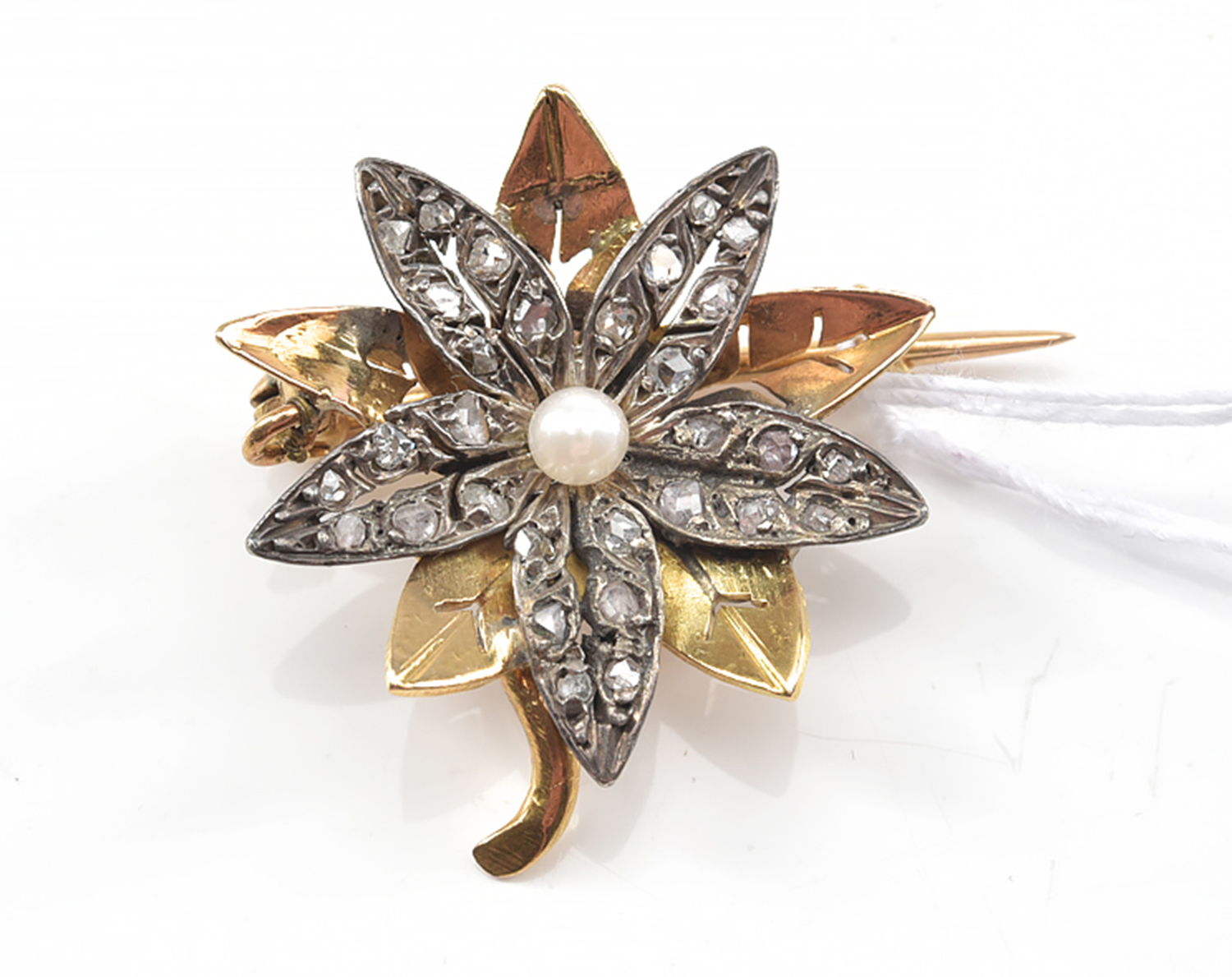 A NATURAL PEARL AND ROSE CUT DIAMOND FLORAL BROOCH IN 15CT GOLD, 5GMS
