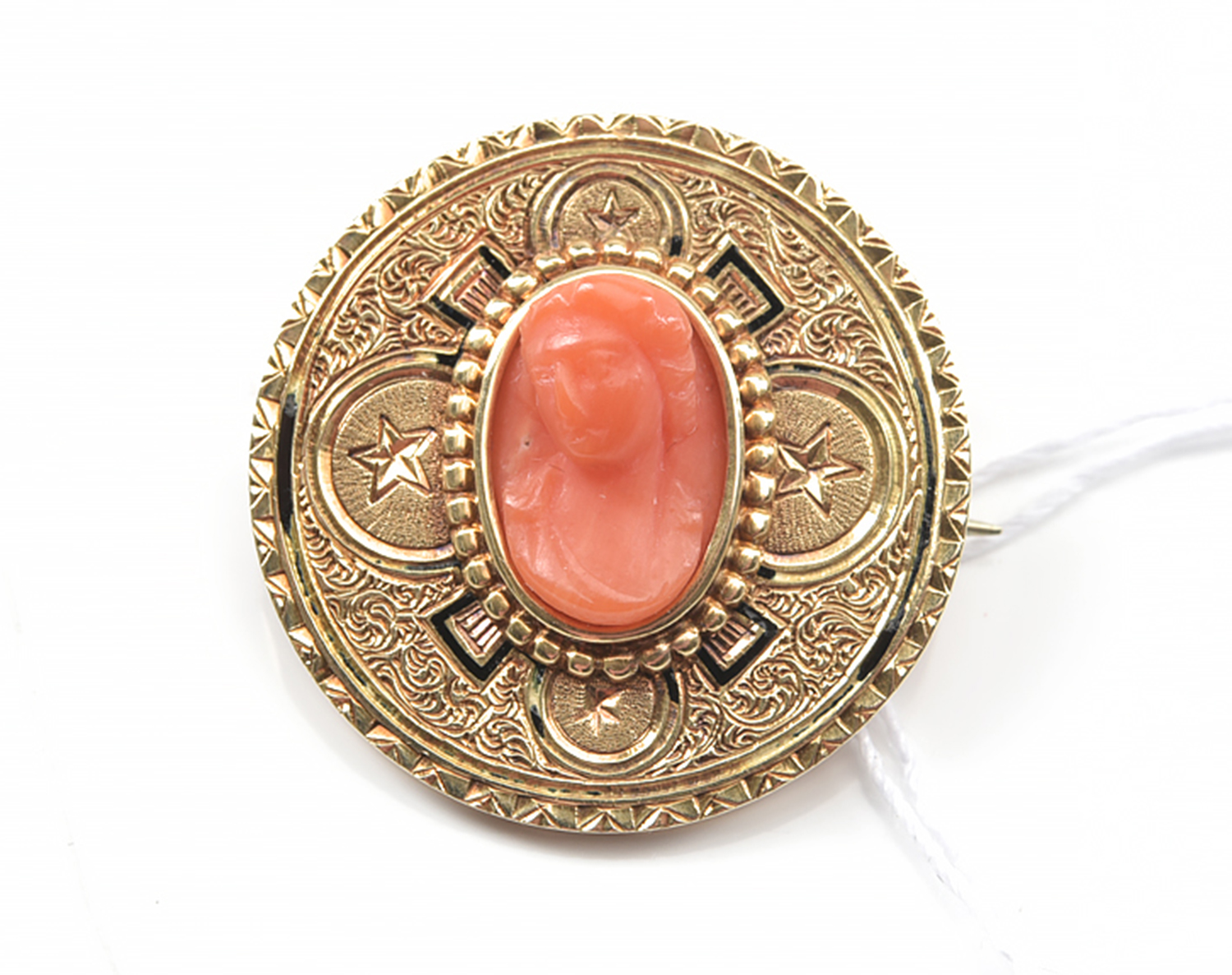 AN ANTIQUE BROOCH CENTRALLY SET WITH A CORAL CAMEO DEPICTING A LADY'S BUST IN 15CT GOLD, DIAMETER 25MM, 4.6GMS