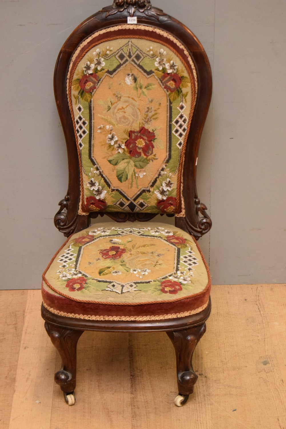AN VICTORIAN NEEDLEWORK COVERED LADIES CHAIR (98H X 46W X 54D CM)