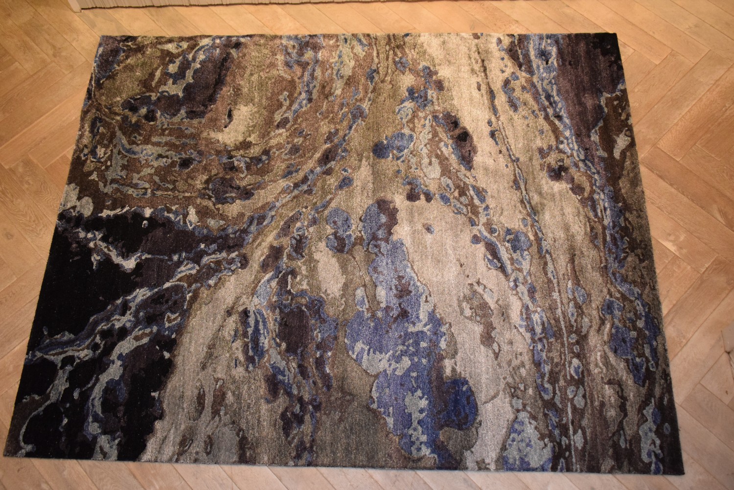 A SOLID & HARD-WEARING MODERN DESIGNER CARPET IN TONES OF BLUES, CHARCOAL & CREAM. HAND-MADE. 100% HAND-SPUN ART SILK TEXTURE TUFTED PILE. DENSE PLUSH PILE. BRAND NEW & IN EXCELLENT CONDITION. SIZE: 305X245CM, ORIGIN: INDIA – RRP: $3,900