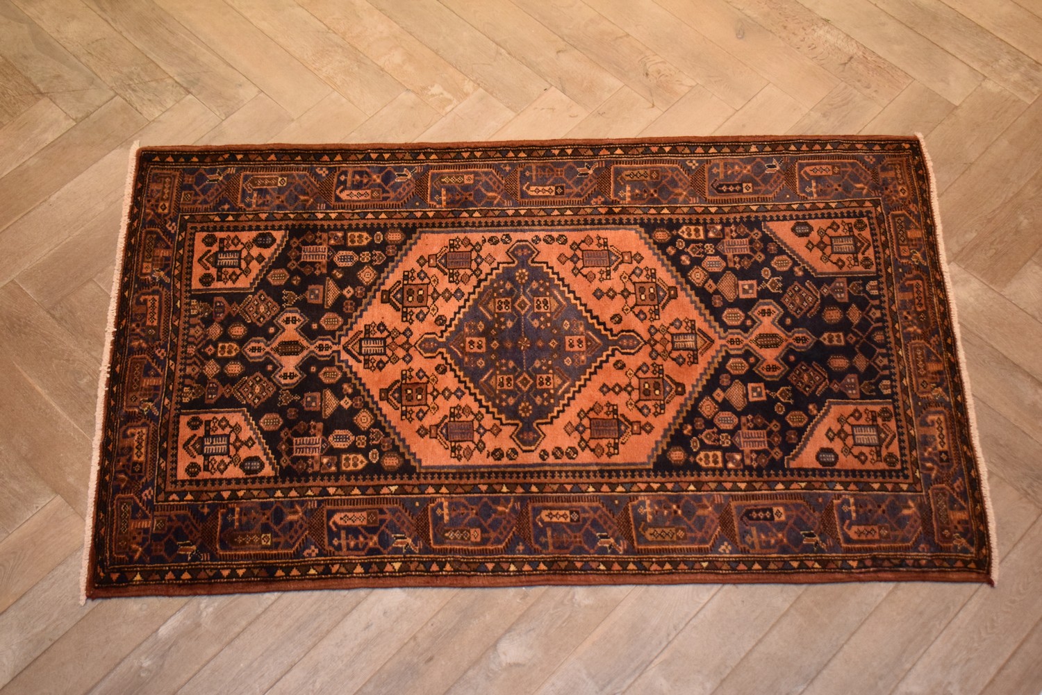 A TRIBAL PERSIAN KHAMSEH RUG, 100% WOOL. IN EXCELLENT CONDITION. VILLAGE WEAVE FROM THE HAMADAN REGION WITH TRIBAL DESIGN OF DIAMOND-SHAPED MEDALLION SET WITHIN A HEXAGONAL MEDALLION IN A DARK TONED FIELD OF HERATI MAHI PATTERNS. CERTIFICATE OF AUTHENTICITY INCLUDED. SIZE: 225X138CM, ORIGIN: PERSIA – RRP: $1,900