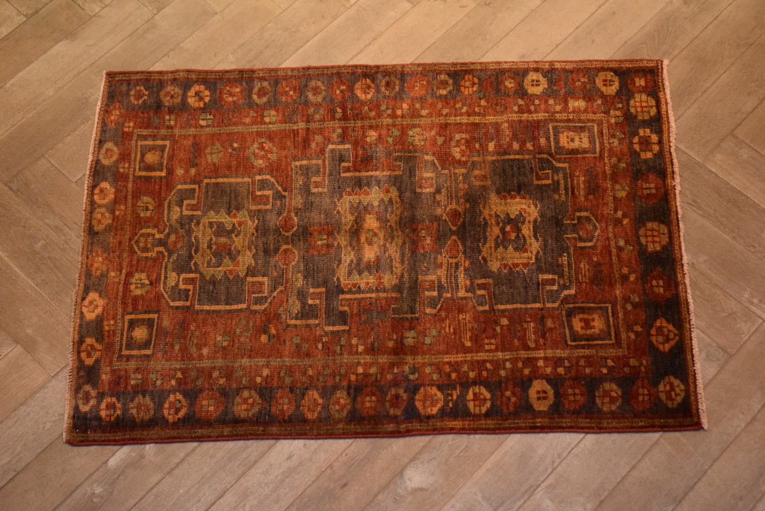 A VINTAGE PERSIAN TRIBAL KURDISH RUG, 100% WOOL. NATURAL DYES. FULLY RESTORED AND IN GOOD CLEAN CONDITION. HAND-KNOTTED TRIBAL WEAVE & DESIGN OF BOLD ANCHORED MEDALLION SET WITHIN A RUST-TONED FIELD. BORDER OF ROSETTES. CERTIFICATE OF AUTHENTICITY INCLUDED. SIZE: 178X127CM, ORIGIN: PERSIA – RRP: $1,600