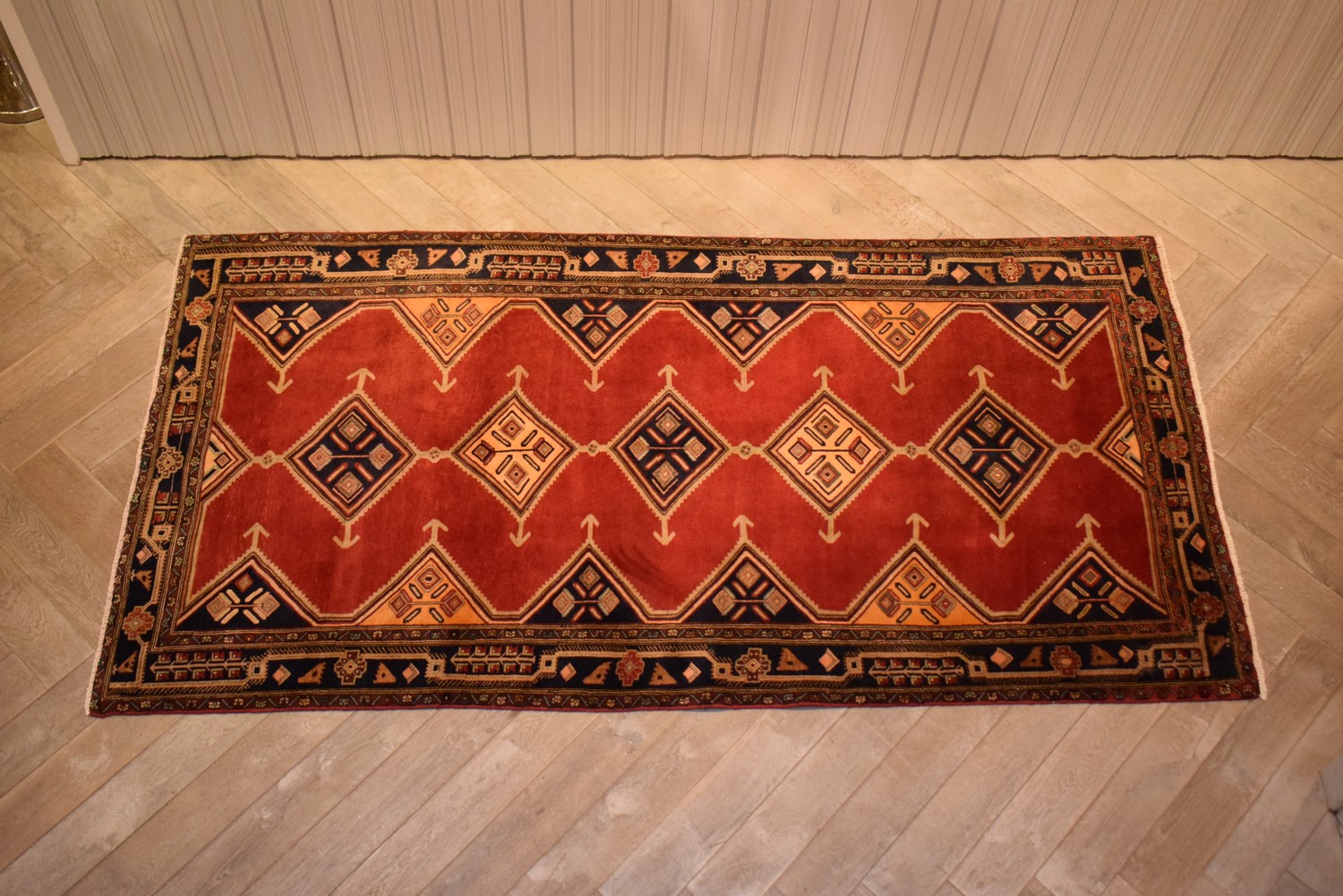 A VINTAGE PERSIAN ZAGHEH RUG, 100% WOOL PILE. EX-GALLERY STOCK. FULLY RESTORED AND IN EXCELLENT CONDITION. HAND-KNOTTED VILLAGE WEAVE WITH TRIBAL DESIGN OF HOOKED DIAMOND-SHAPED MEDALLIONS AND SEMI-MEDALLIONS IN AN OPEN CORAL-TONED FIELD. CERTIFICATE OF AUTHENTICITY INCLUDED. SIZE: 304X157CM, ORIGIN: PERSIA – RRP: $2,600