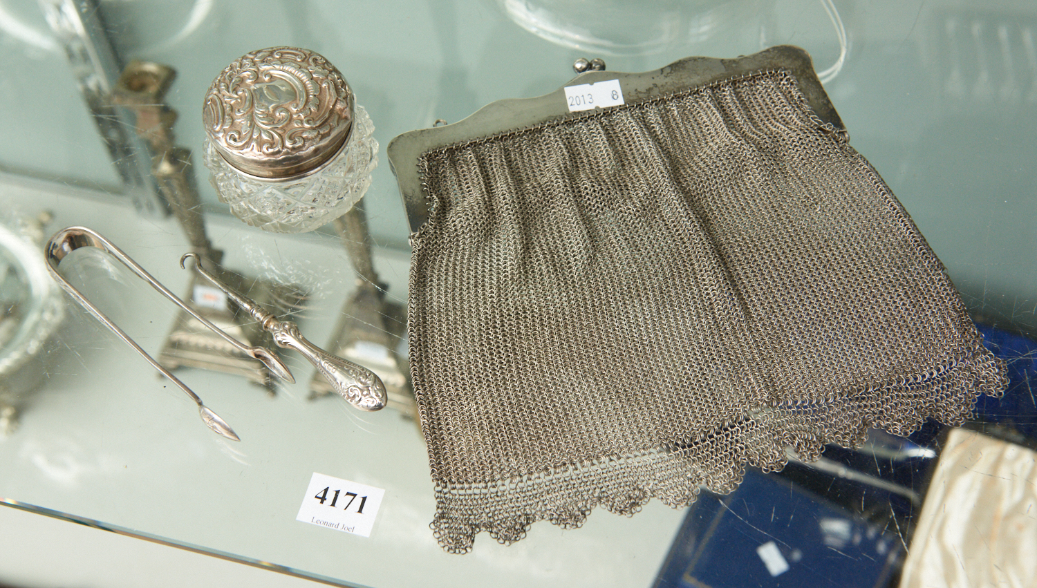 A COLLECTION OF CONTINENTAL AND STERLING SILVER ITEMS, INCLUDING AN EVENING BAG, SUGAR TONGS AND COSMETIC JAR