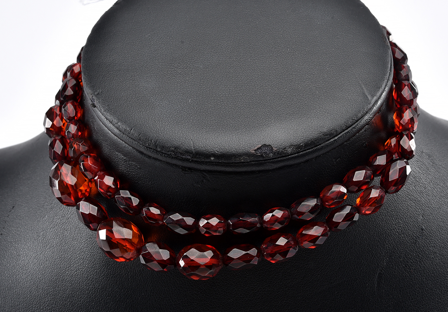 A STRAND OF VINTAGE RED BAKELITE BEADS