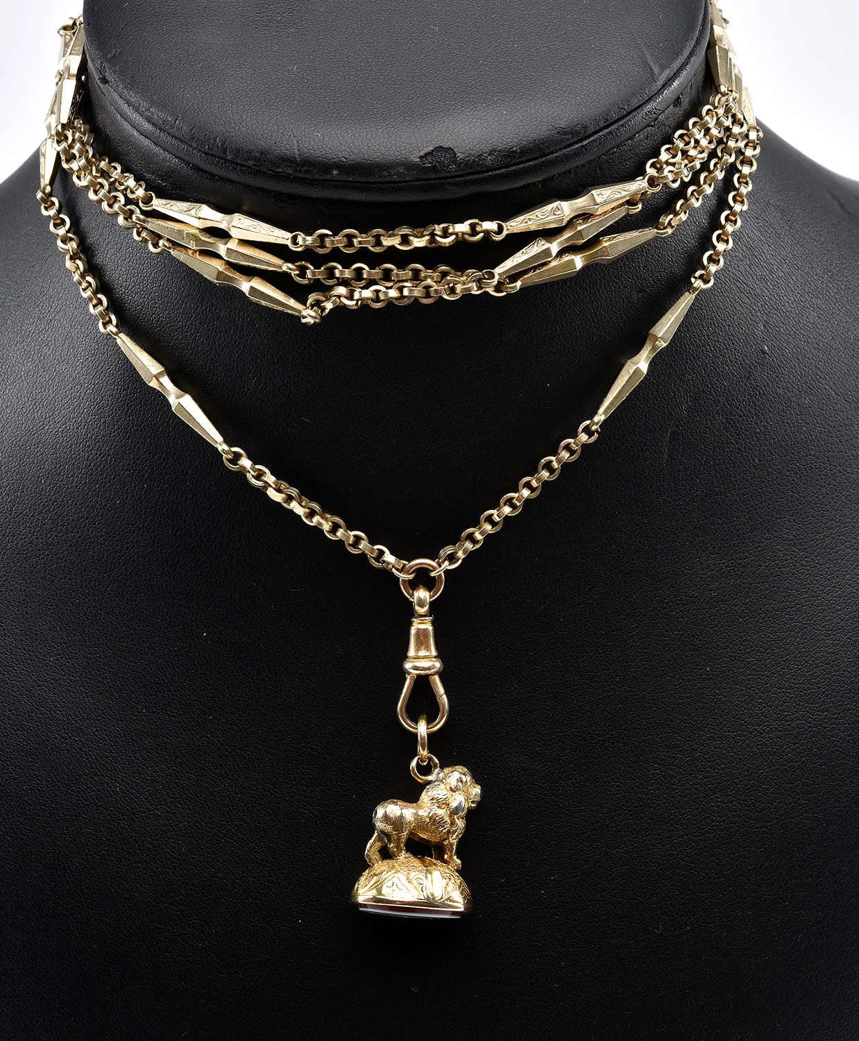 A FANCY LINK GUARD CHAIN WITH SEAL FOB, ALL GOLD LINED