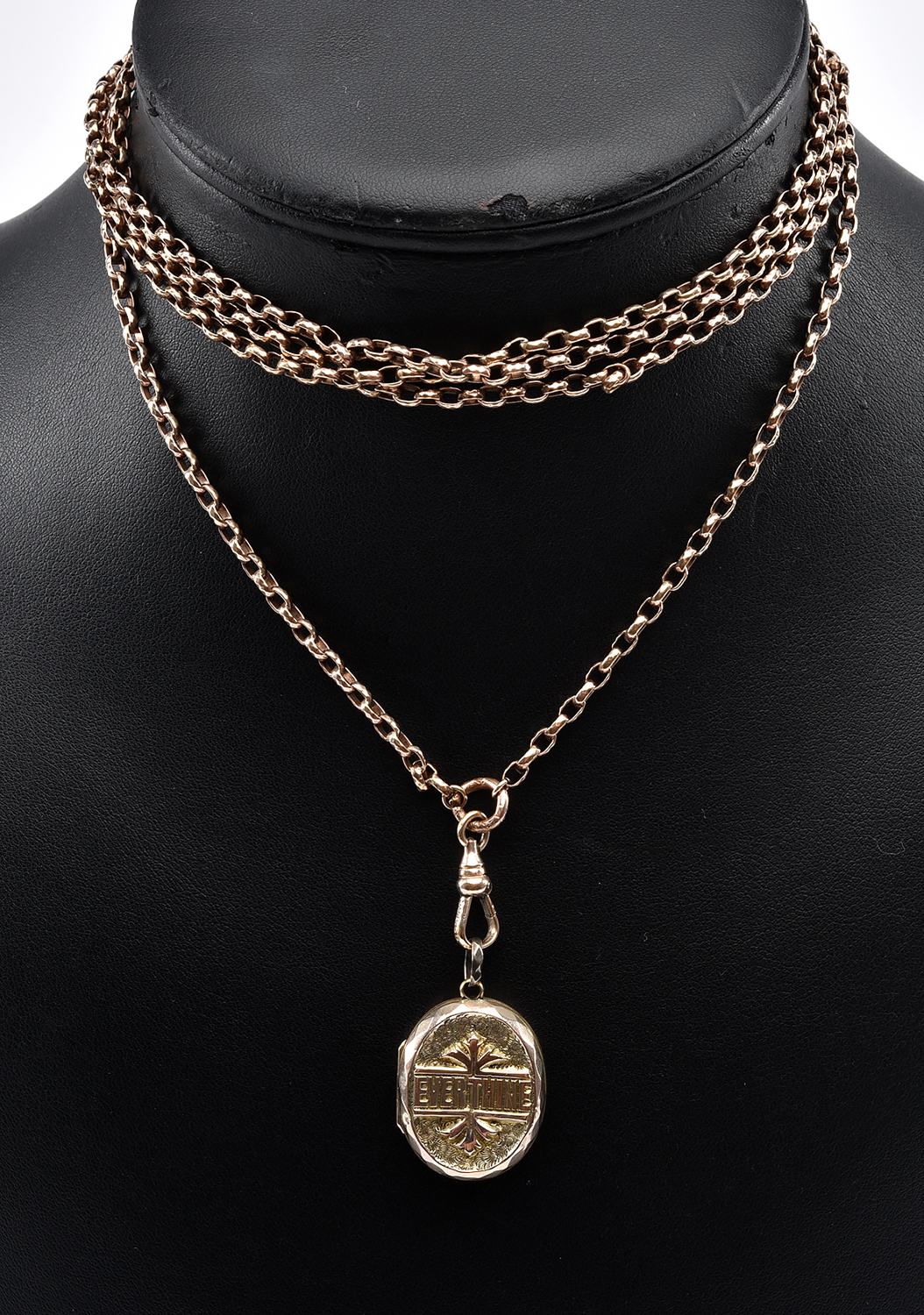 AN ANTIQUE GOLD LINED GUARD CHAIN WITH LOCKET