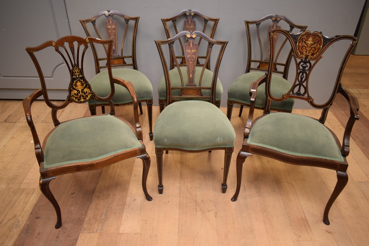 A SET OF SIX SOLID ROSEWOOD SHERATON REVIVAL DINING CHAIRS WITH DECORATIVE INLAY INCLUDING TWO CARVERS (CARVERS 92H X 58W X 50D CM)