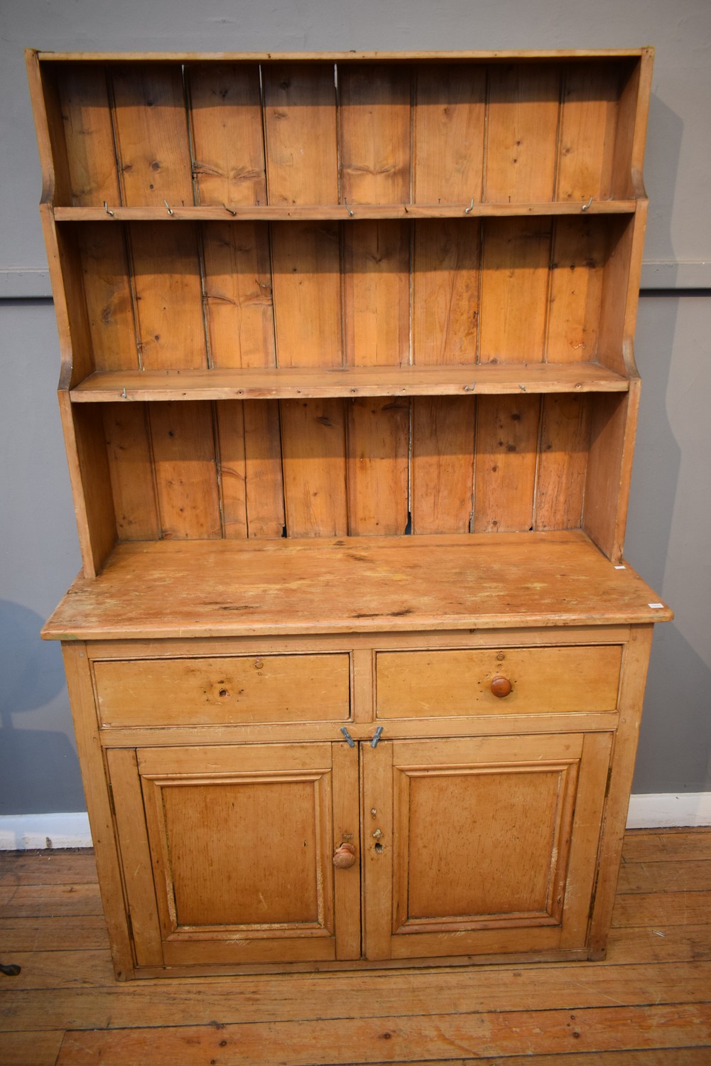 A 19TH CENTURY PINE KITCHEN DRESSER (A/F DOOR KNOBS MISSING) (198H X 123W X 48D CM) (PLEASE NOTE THIS ITEM MUST BE REMOVED BY CLIENTS OR CARRIERS AT THE CUSTOMERS EXPENSE)