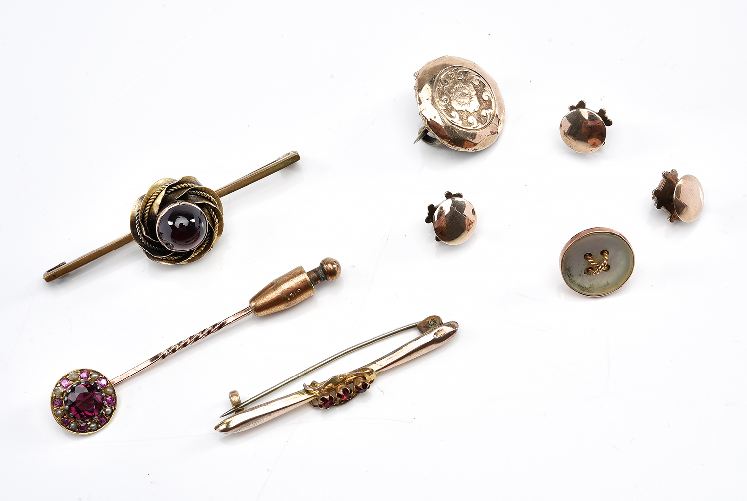 A COLLECTION OF GOLD FINDINGS INCLUDING A SHIRT STUD IN 9CT GOLD AND A GARNET SET STICK PIN IN 9CT GOLD