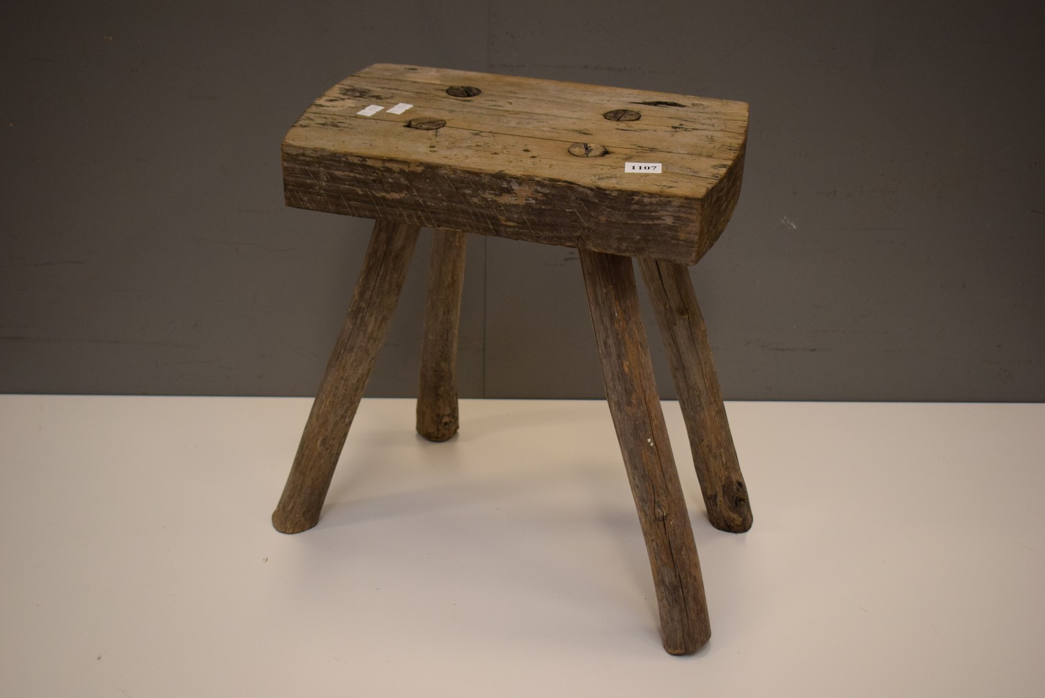 A 19TH CENTURY AUSTRALIAN FOUR LEGGED BRANCH CONSTRUCTED STOOL (38H X 41W X 23D CM)