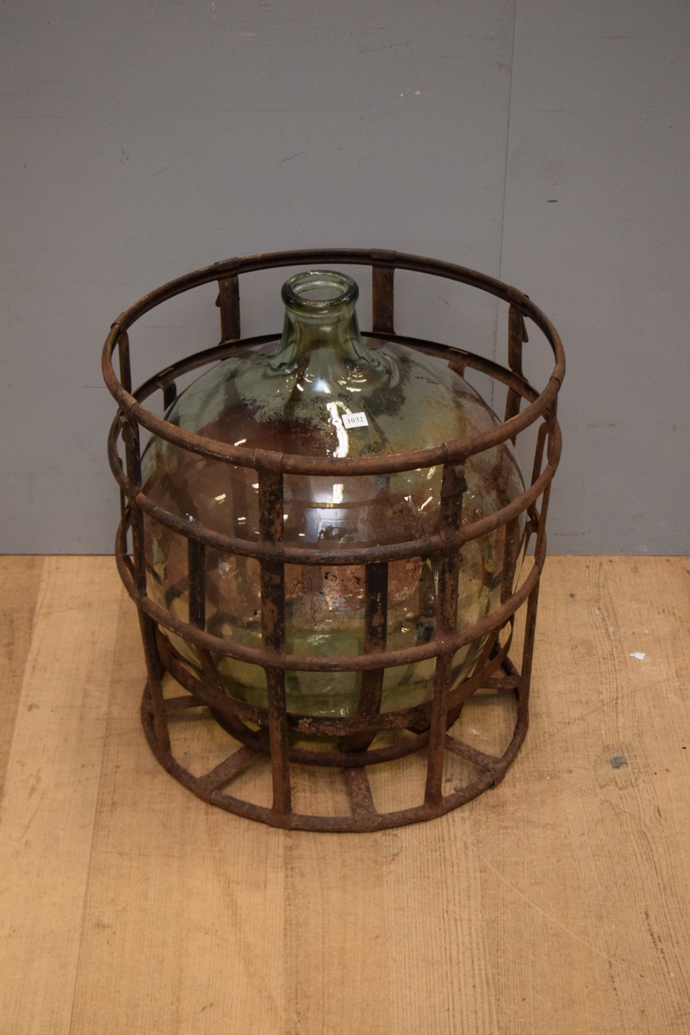 A LARGE 19TH CENTURY FRENCH DEMIJOHN IN ORIGINAL METAL PROTECTIVE CAGE (58H X 53W CM)