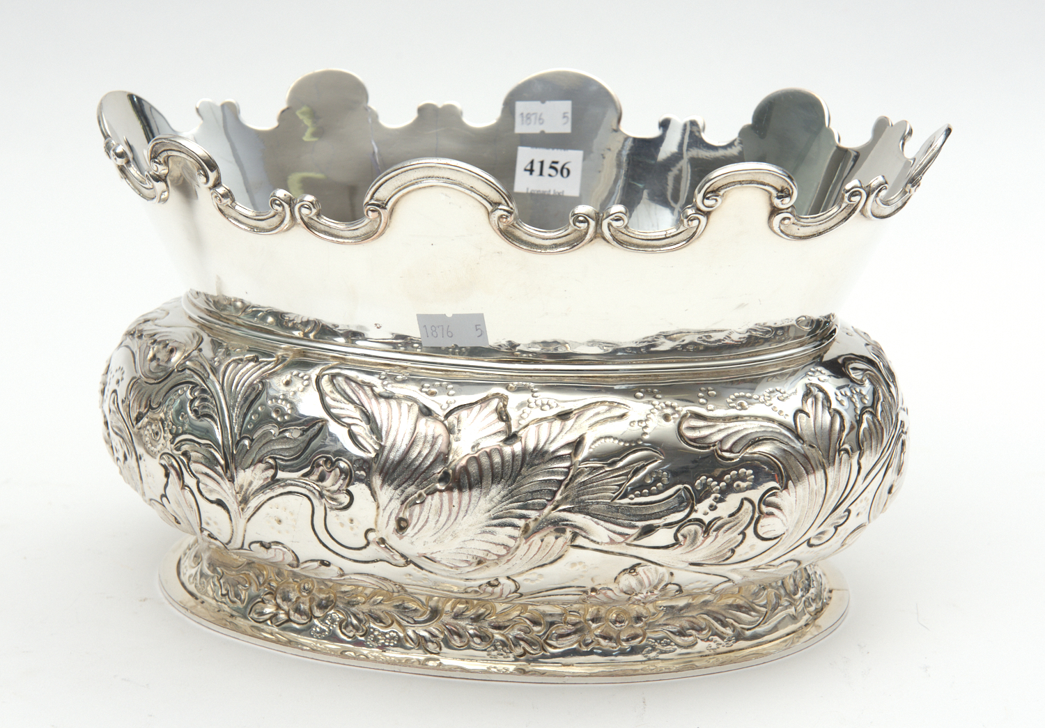 A 19TH CENTURY ENGLISH SILVERPLATE OVAL MONTEITH CENTRE BOWL WITH SCALLOPED EDGES AND FLORAL ENGRAVING W.29CM