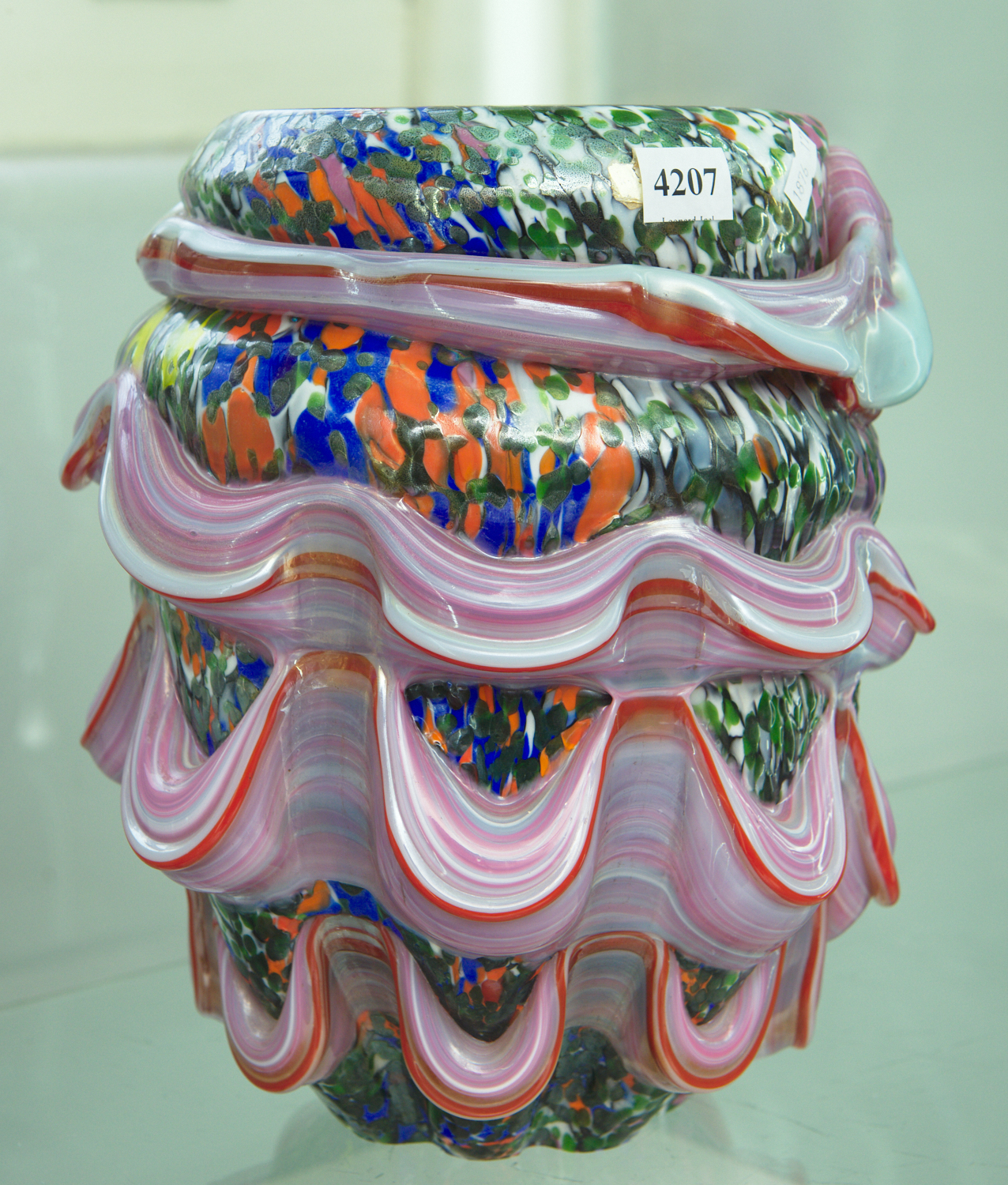 AN IMPRESSIVE HEAVY 1960S MURANO GLASS VASE OF TUTTI FRUTTI COLOURING H.25CM