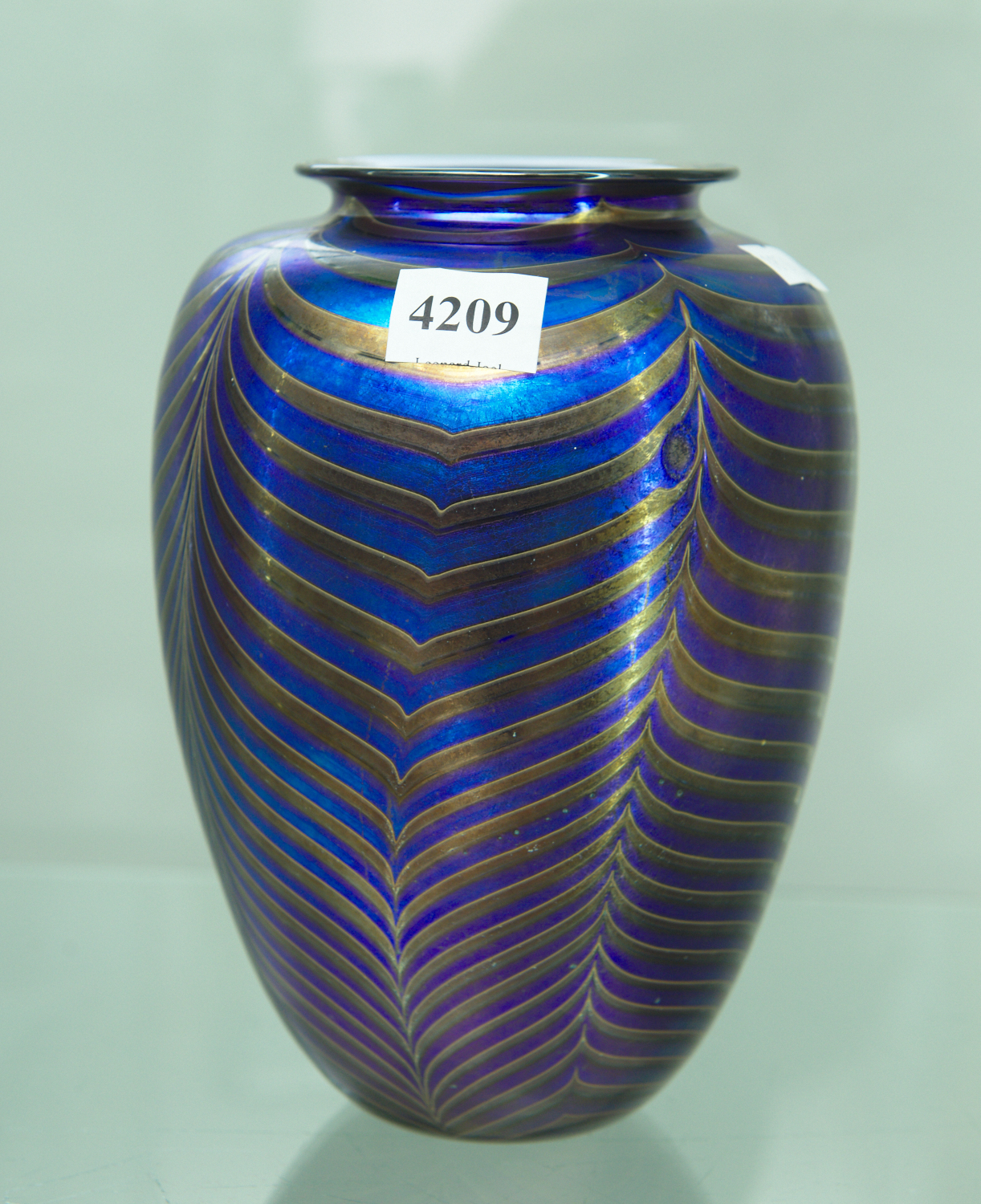 A 1980S AUSTRALIAN SIGNED DENIZEN IRRIDESCENT GLASS VASE H.18CM