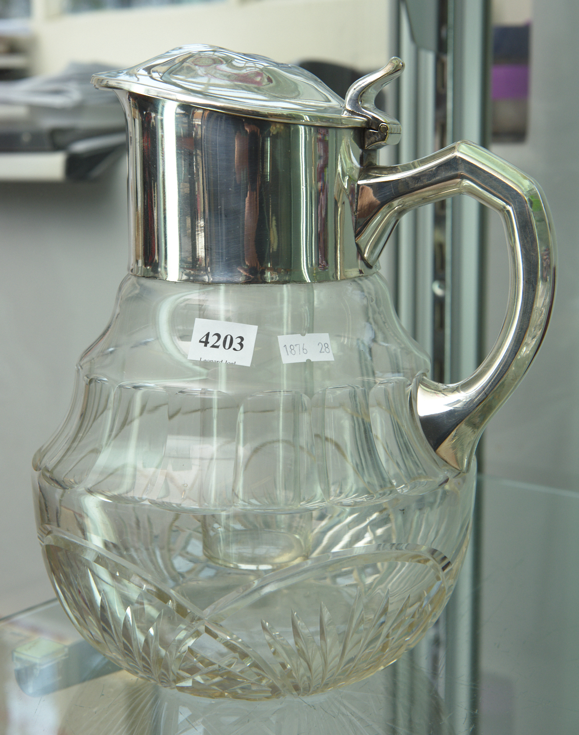 A 1920S GERMAN WMF SILVERPLATE AND CUT CRYSTAL WATER JUG WITH INTERNAL LIFT OUT ICE HOLDER H.27CM
