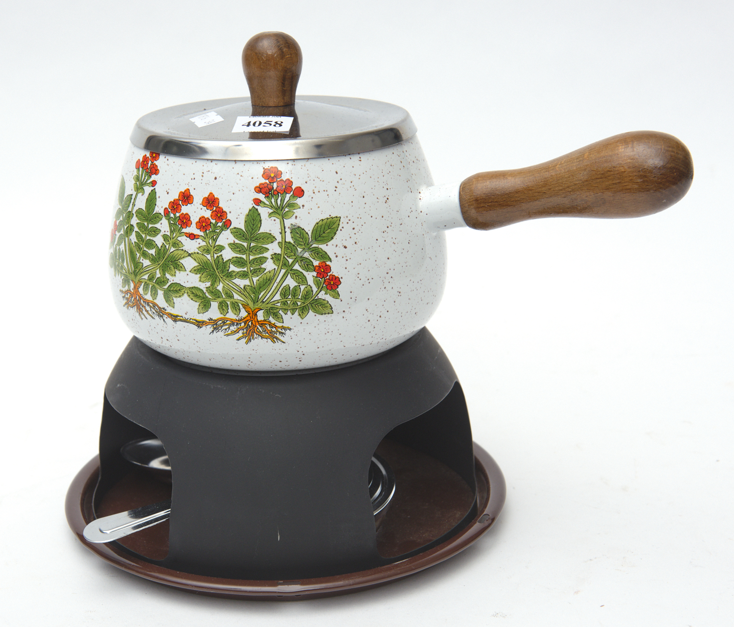 A 1960S JAPANESE ENAMEL AND WOODEN FONDUE SET