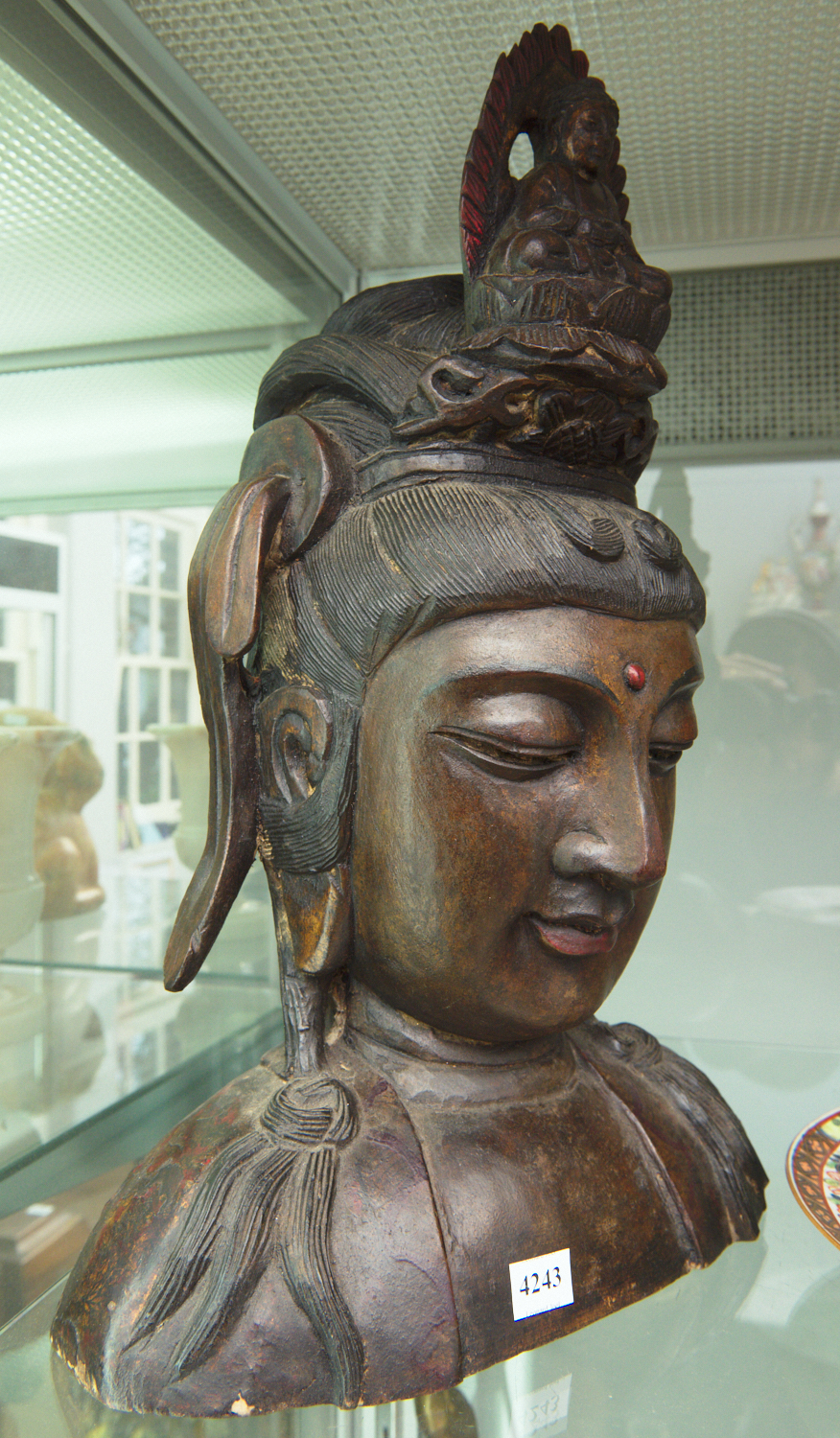 A 19TH CENTURY CHINESE CARVED WOODEN BUST OF A GODDESS H.44CM