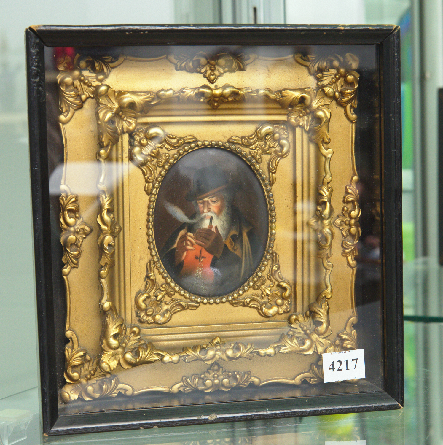 A GILT FRAMED MINIATURE ON PORCELAIN OF A MAN SMOKING A PIPE IN OUTER EBONISED FRAME 21 X 21CM