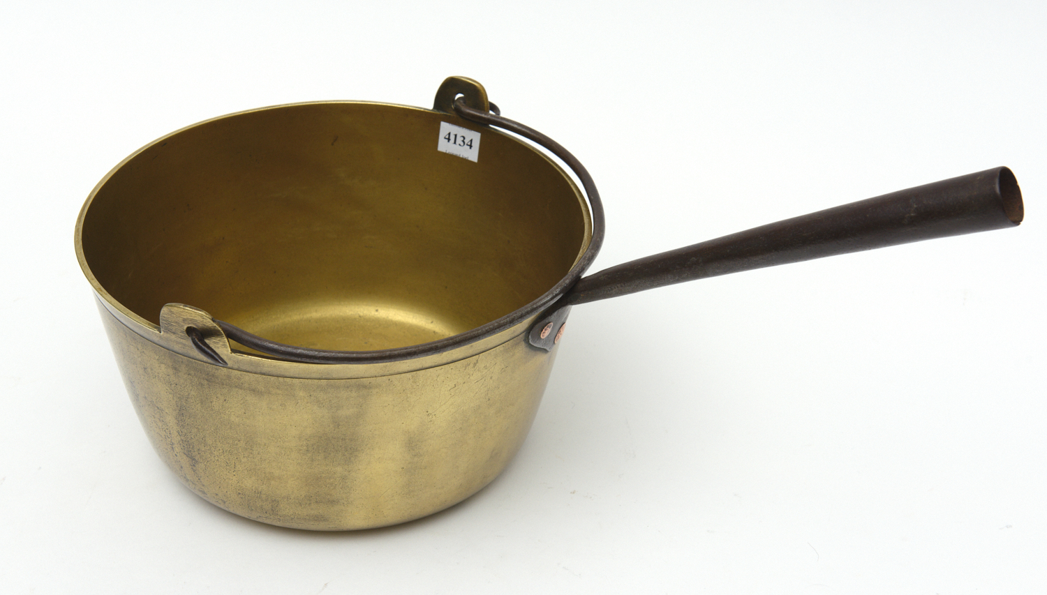 A 19TH CENTURY HEAVY BRASS JAM PAN WITH CAST IRON HANDLE AND HANGER