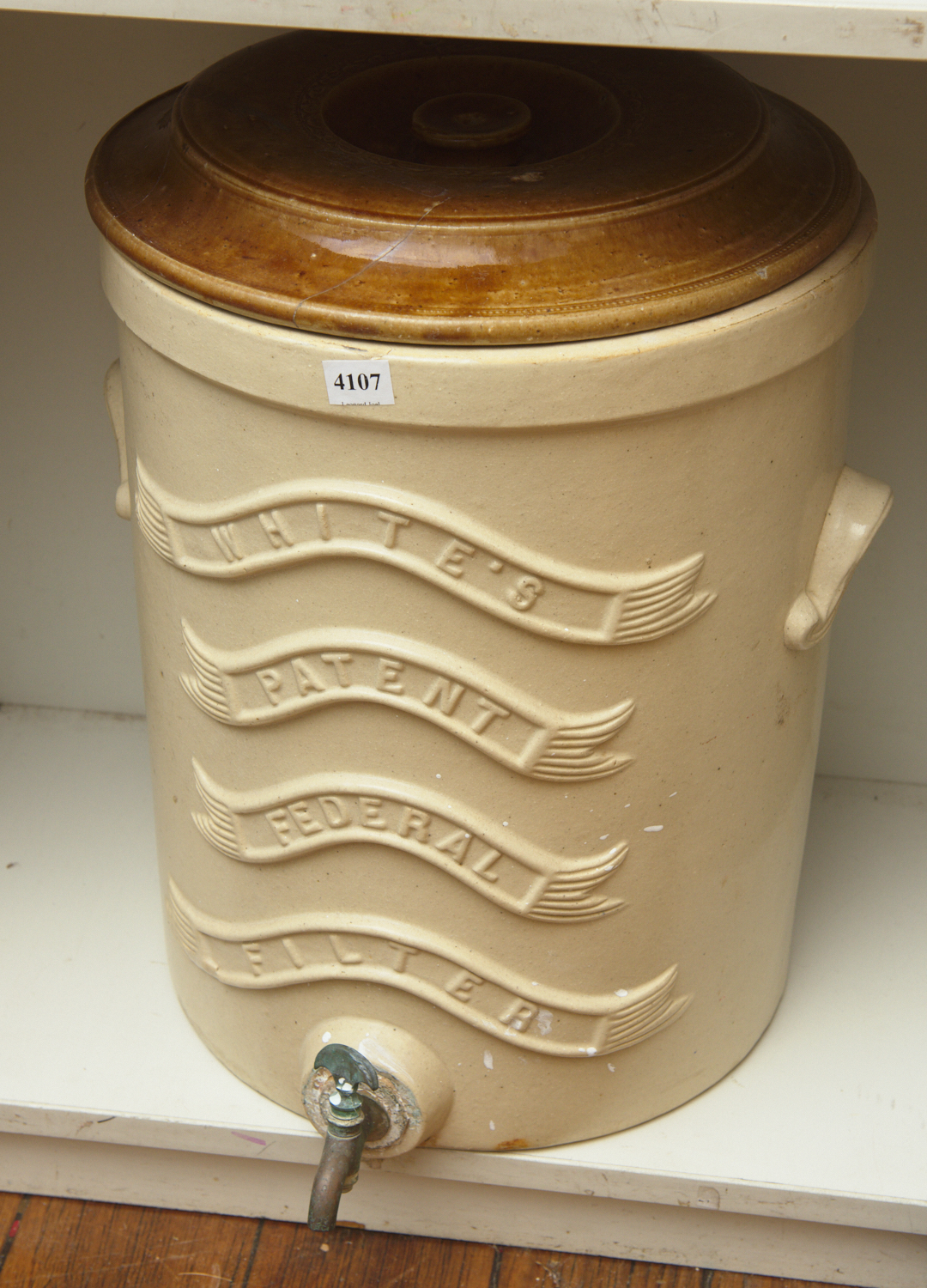 AN AUSTRALIAN STONEWARE WHITES FEDERAL FILTER (A/F TO LID) H.44CM