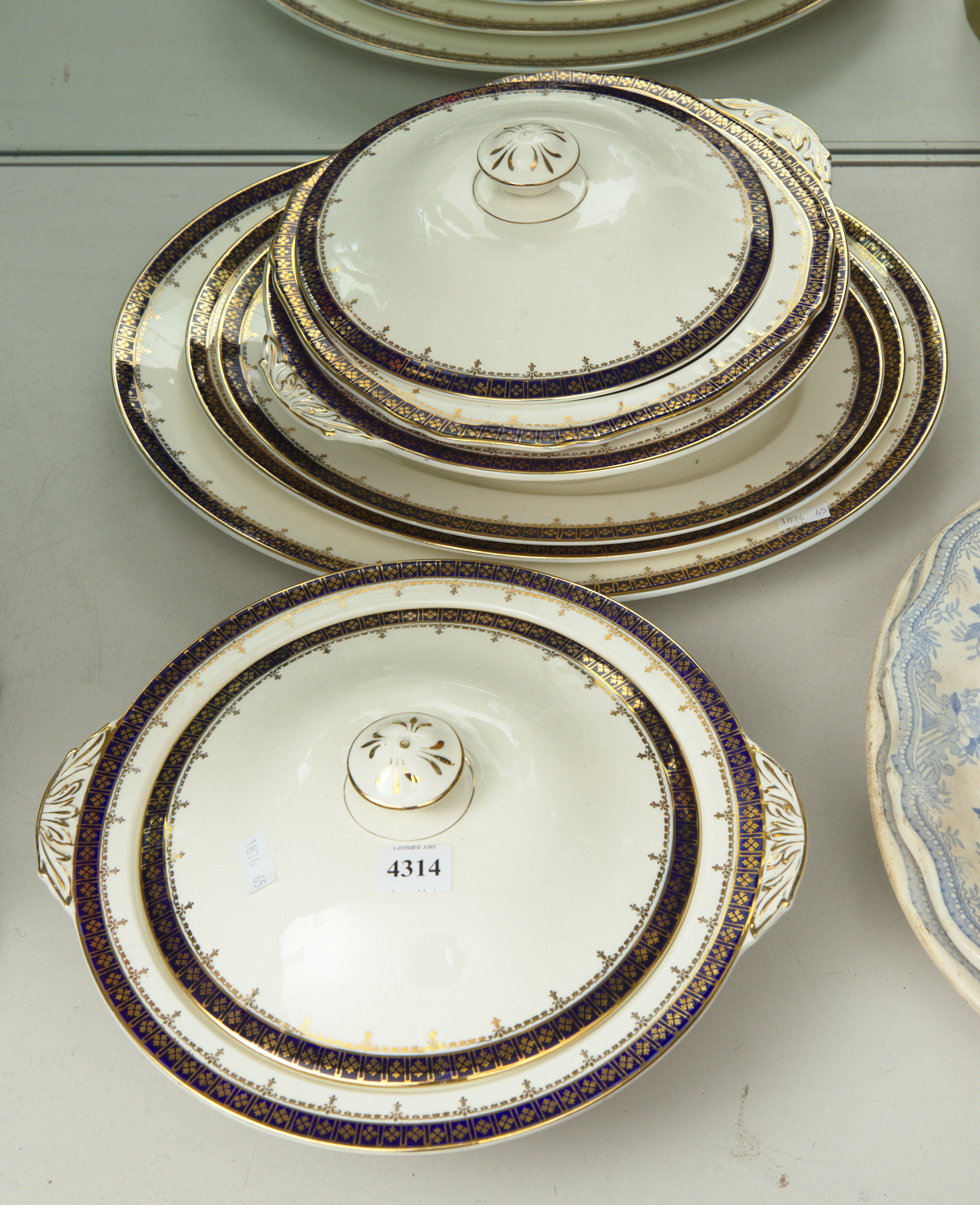 A 1920S ALFRED MEAKIN BLEU DE ROI SERVING SET COMPRISING THREE MEAT PLATES AND TWO TUREENS