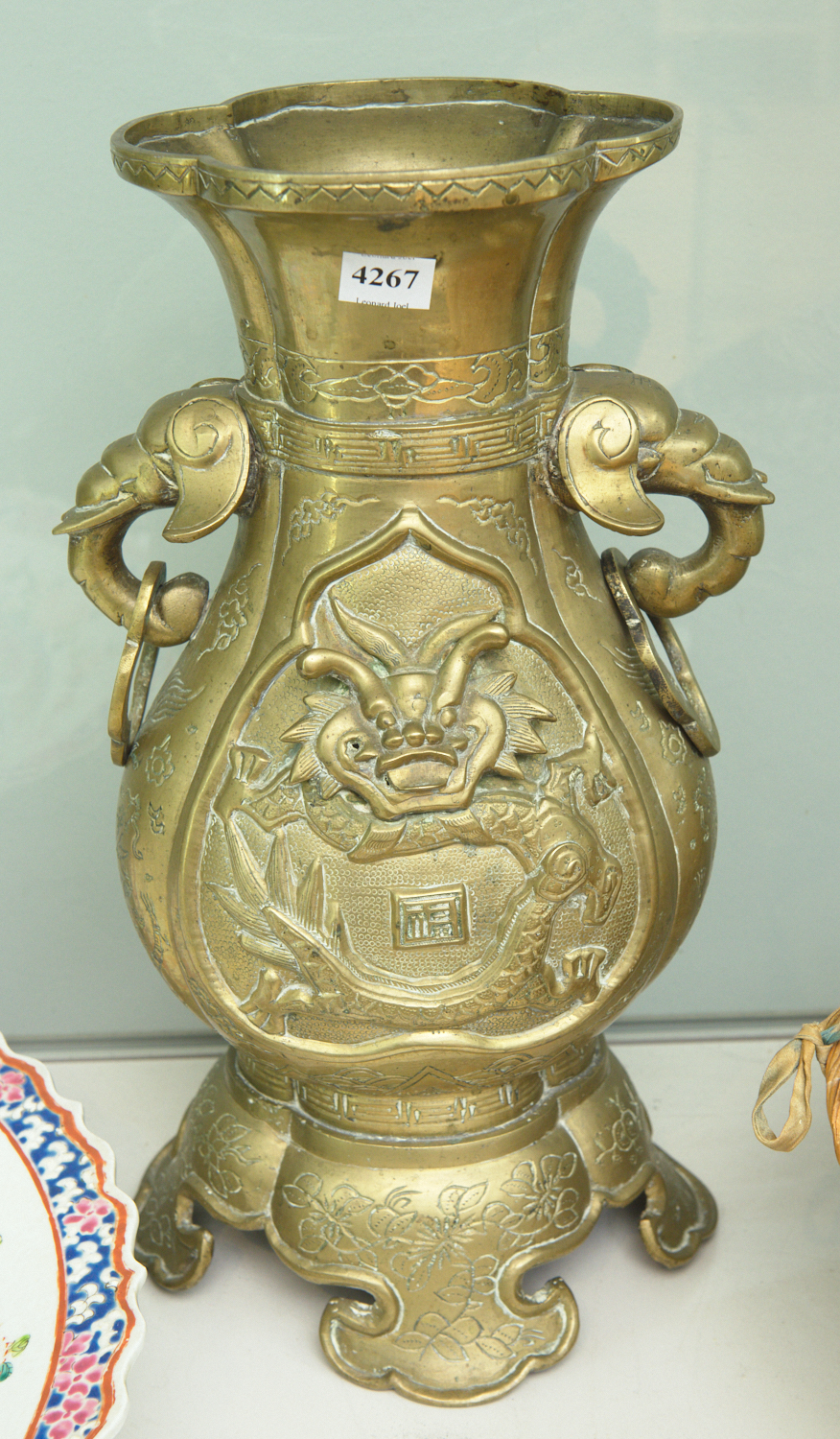 A 19TH CENTURY SIGNED CHINESE BRASS VASE WITH ELEPHANT HANDLES
