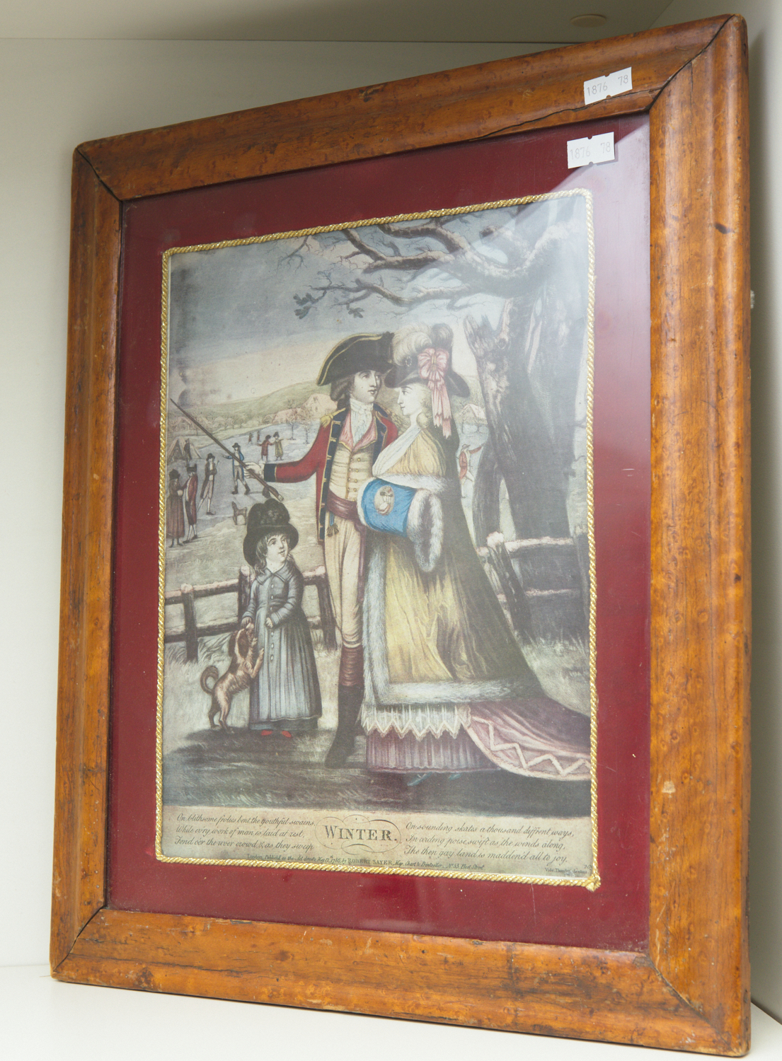 A 19TH CENTURY BURR WALNUT FRAMED HAND COLOURED ETCHING OF WINTER