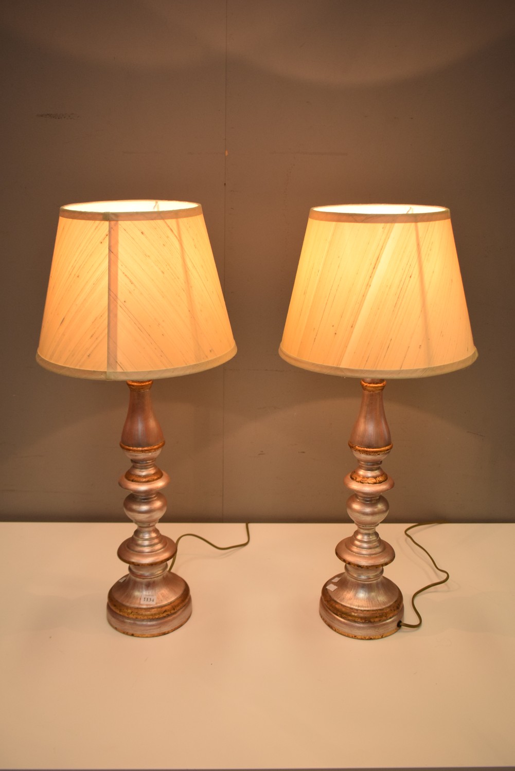 A PAIR OF TURNED TIMBER TABLE LAMPS WITH SILVER PAINTED FINISH (72H X 30W CM)