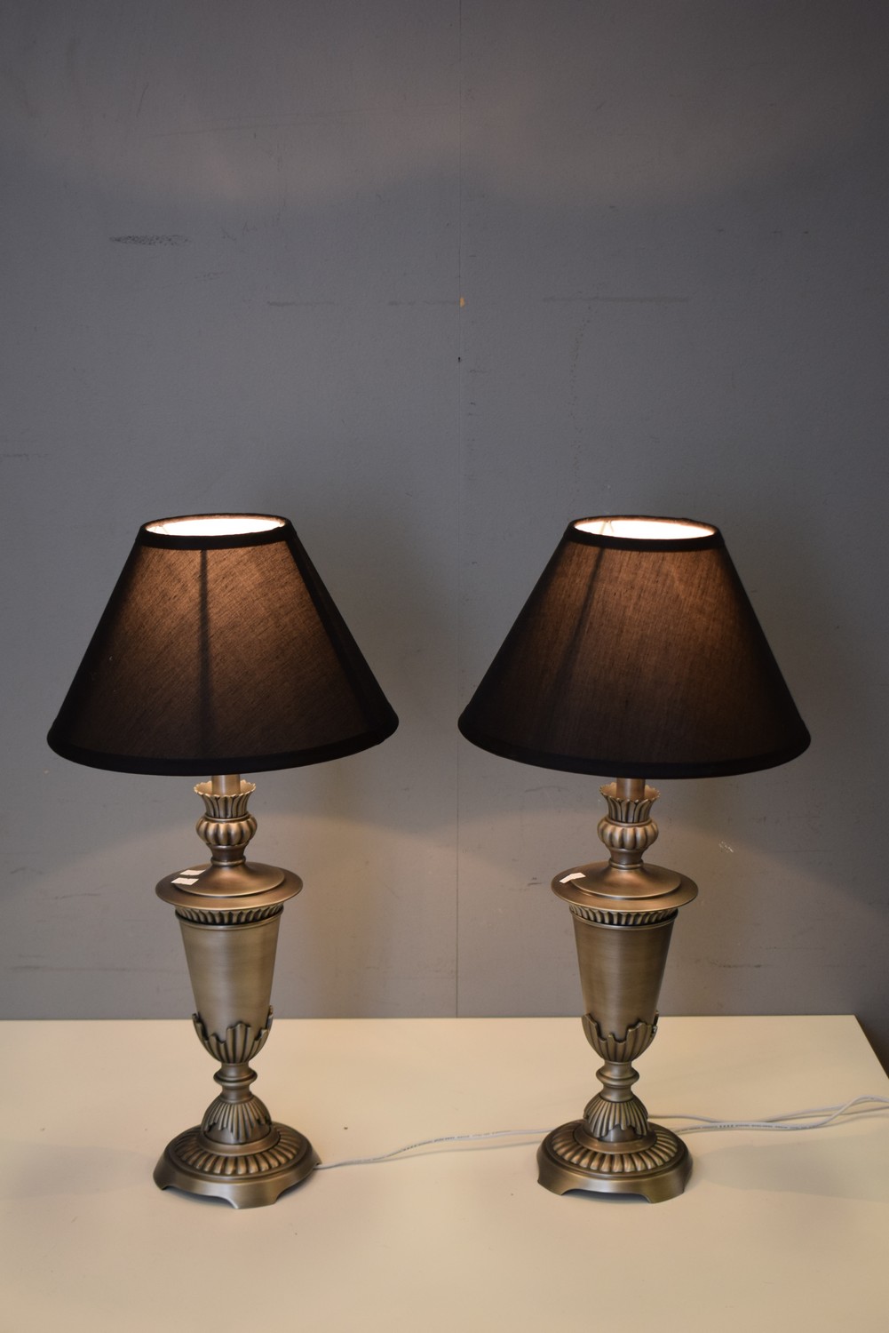 A PAIR OF CLASSICAL STYLE BRUSHED METAL TABLE LAMPS (60H X 31D CM)
