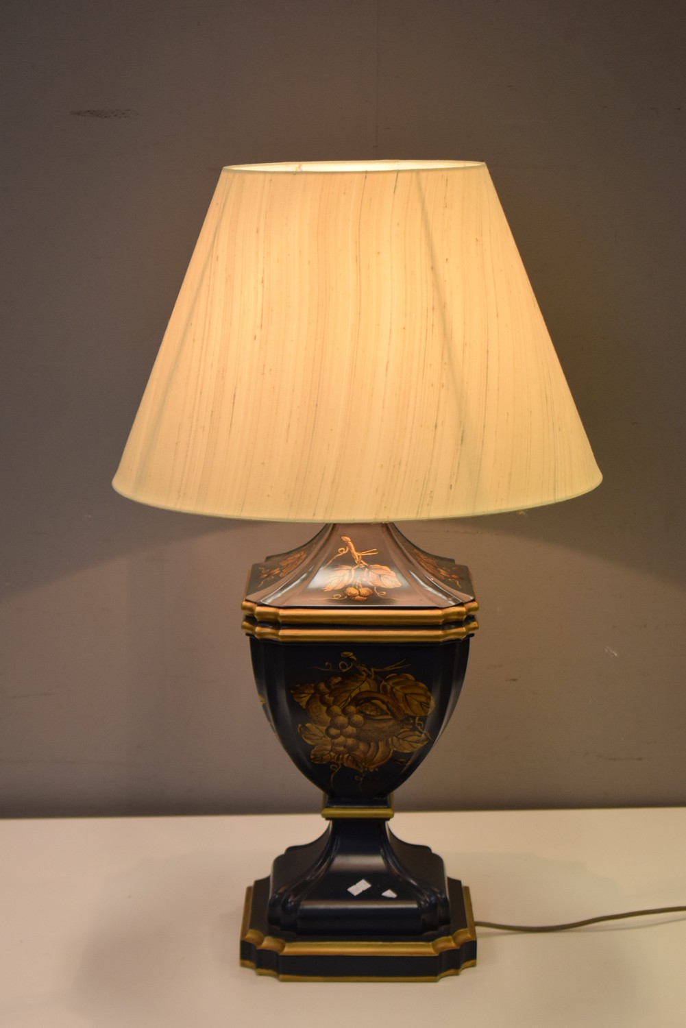 A CLASSICAL STYLE TIMBER TABLE LAMP WITH HAND PAINTED DETAILING (80H X 47W CM)