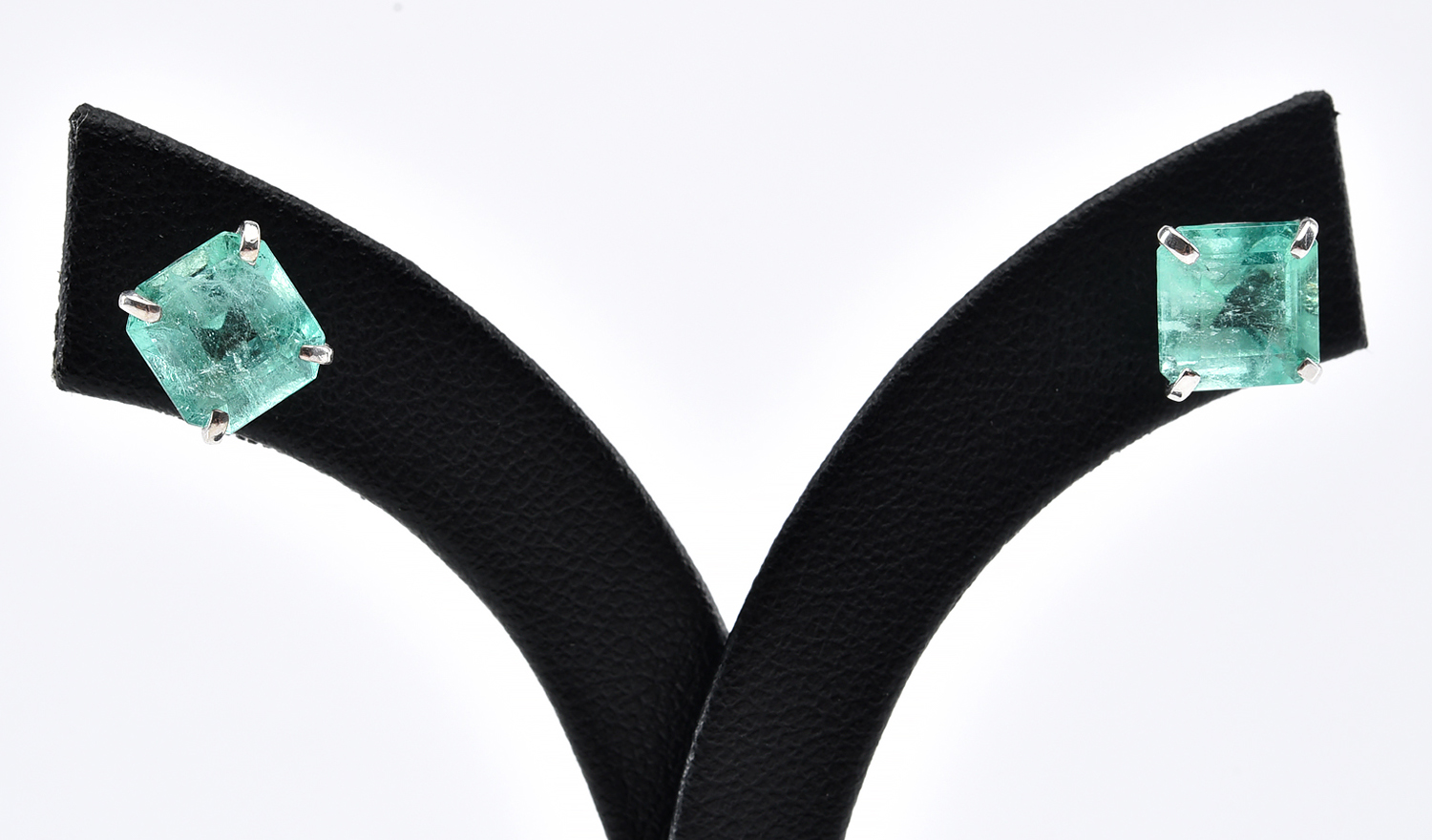 A PAIR OF COLUMBIAN EMERALD STUD EARRINGS TOTALLING 3.42CTS, IN 18CT WHITE GOLD